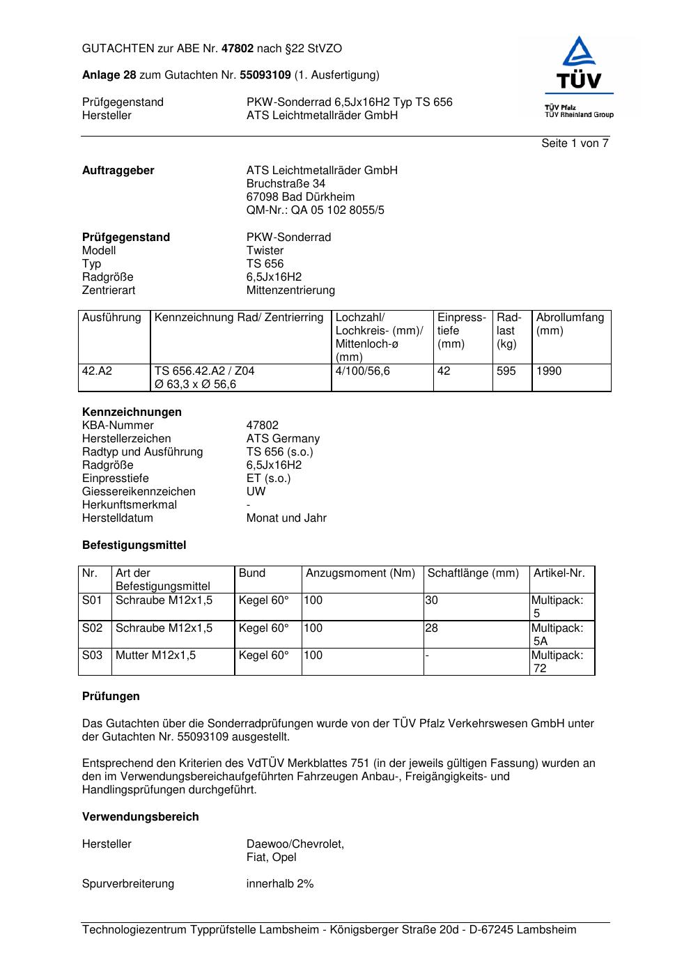 Dieses Gutachten (abe) bezieht sich auf die Alufelge ATS TS 656 in der Ausführung 6.5Jx16 ET 0, Mittenloch 0 mm (KBA 47802). Im PDF findest du typischerweise zulässige Reifengrößen, Auflagen/Anbauhinweise und – je nach Dokument – Hinweise zur Eintragung.