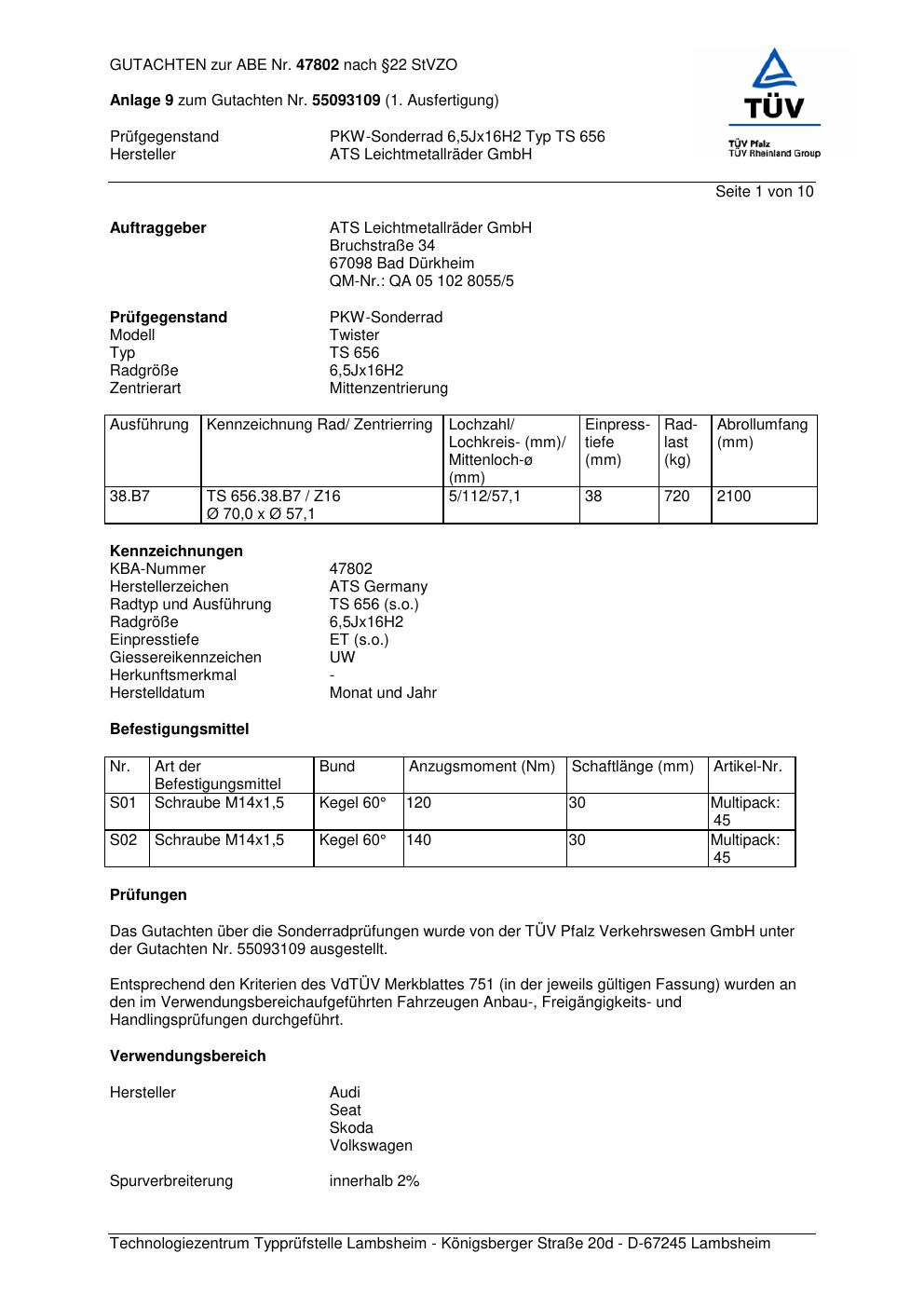 Dieses Gutachten (abe) bezieht sich auf die Alufelge ATS TS 656 in der Ausführung 6.5Jx16 ET 0, Mittenloch 0 mm (KBA 47802). Im PDF findest du typischerweise zulässige Reifengrößen, Auflagen/Anbauhinweise und – je nach Dokument – Hinweise zur Eintragung.