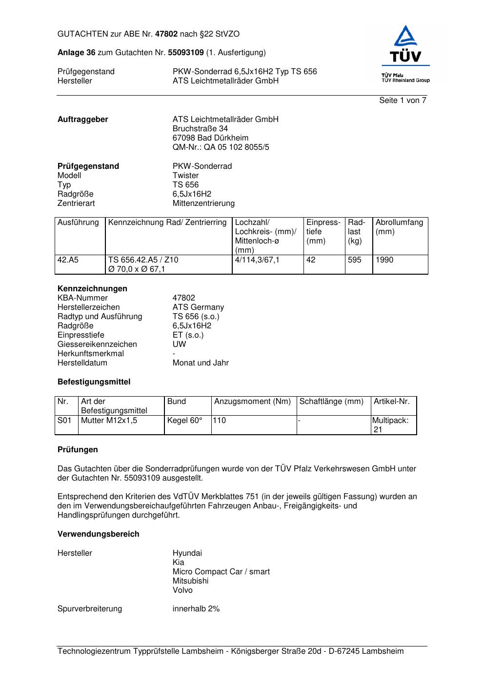 Dieses Gutachten (abe) bezieht sich auf die Alufelge ATS TS 656 in der Ausführung 6.5Jx16 ET 0, Mittenloch 0 mm (KBA 47802). Im PDF findest du typischerweise zulässige Reifengrößen, Auflagen/Anbauhinweise und – je nach Dokument – Hinweise zur Eintragung.