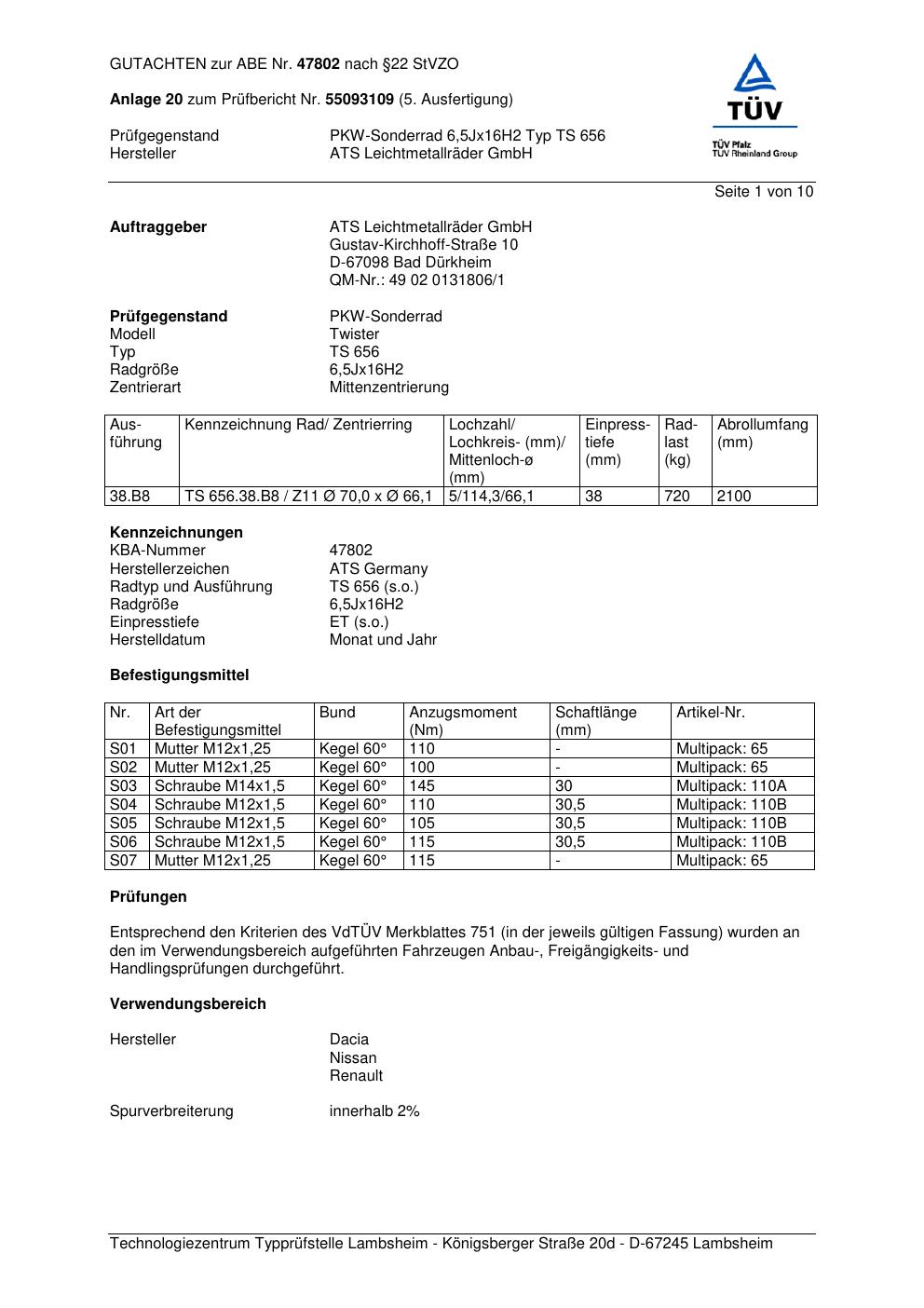 Felgengutachten / abe für Alufelgen ATS TS 656 (6.5Jx16 ET 0, Mittenloch 0 mm) mit KBA 47802 (Zertifikatsnummer 47802). Hier kostenlos als PDF herunterladen. Der Download-Link ist 24 Stunden gültig und kann bis zu zwei Mal verwendet werden.