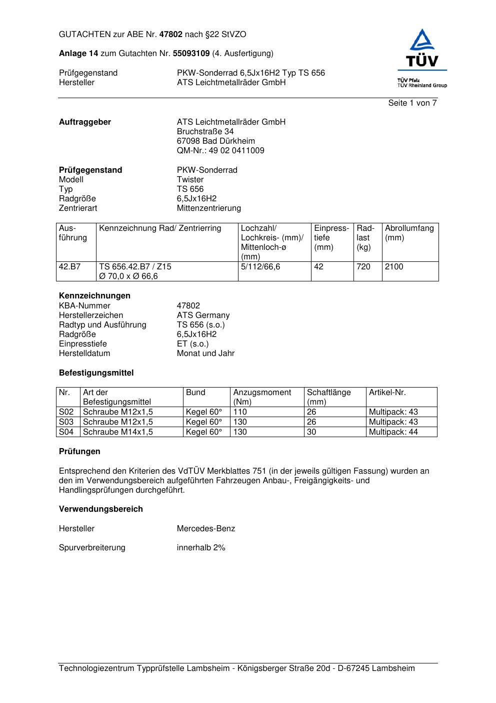 Dieses Gutachten (abe) bezieht sich auf die Alufelge ATS TS 656 in der Ausführung 6.5Jx16 ET 0, Mittenloch 0 mm (KBA 47802). Im PDF findest du typischerweise zulässige Reifengrößen, Auflagen/Anbauhinweise und – je nach Dokument – Hinweise zur Eintragung.