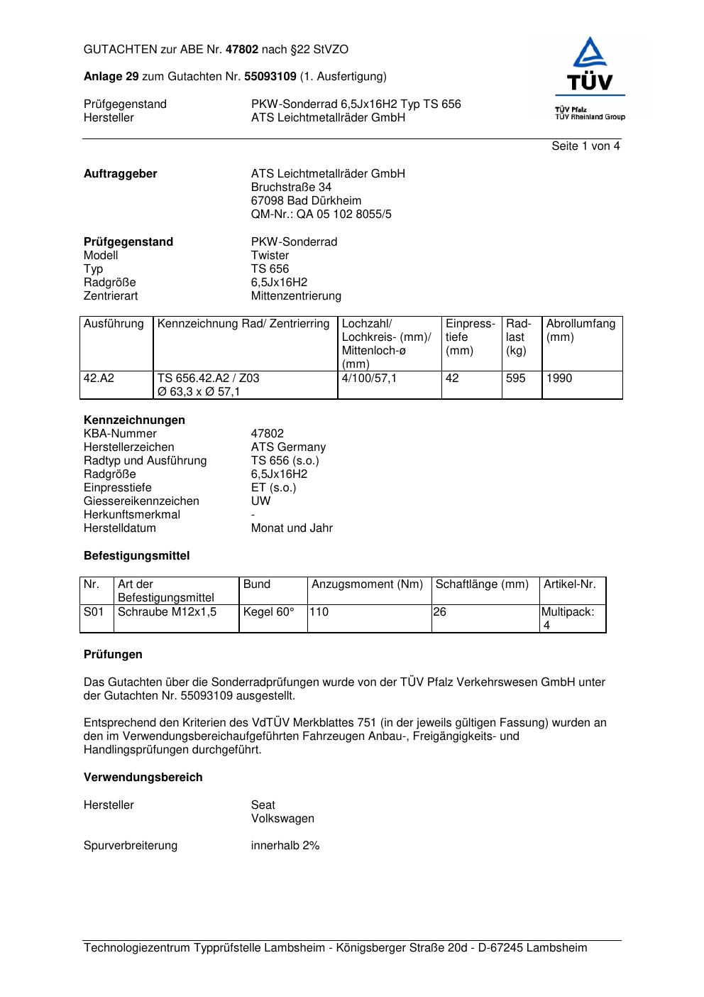 Felgengutachten / abe für Alufelgen ATS TS 656 (6.5Jx16 ET 0, Mittenloch 0 mm) mit KBA 47802 (Zertifikatsnummer 47802). Hier kostenlos als PDF herunterladen. Der Download-Link ist 24 Stunden gültig und kann bis zu zwei Mal verwendet werden.