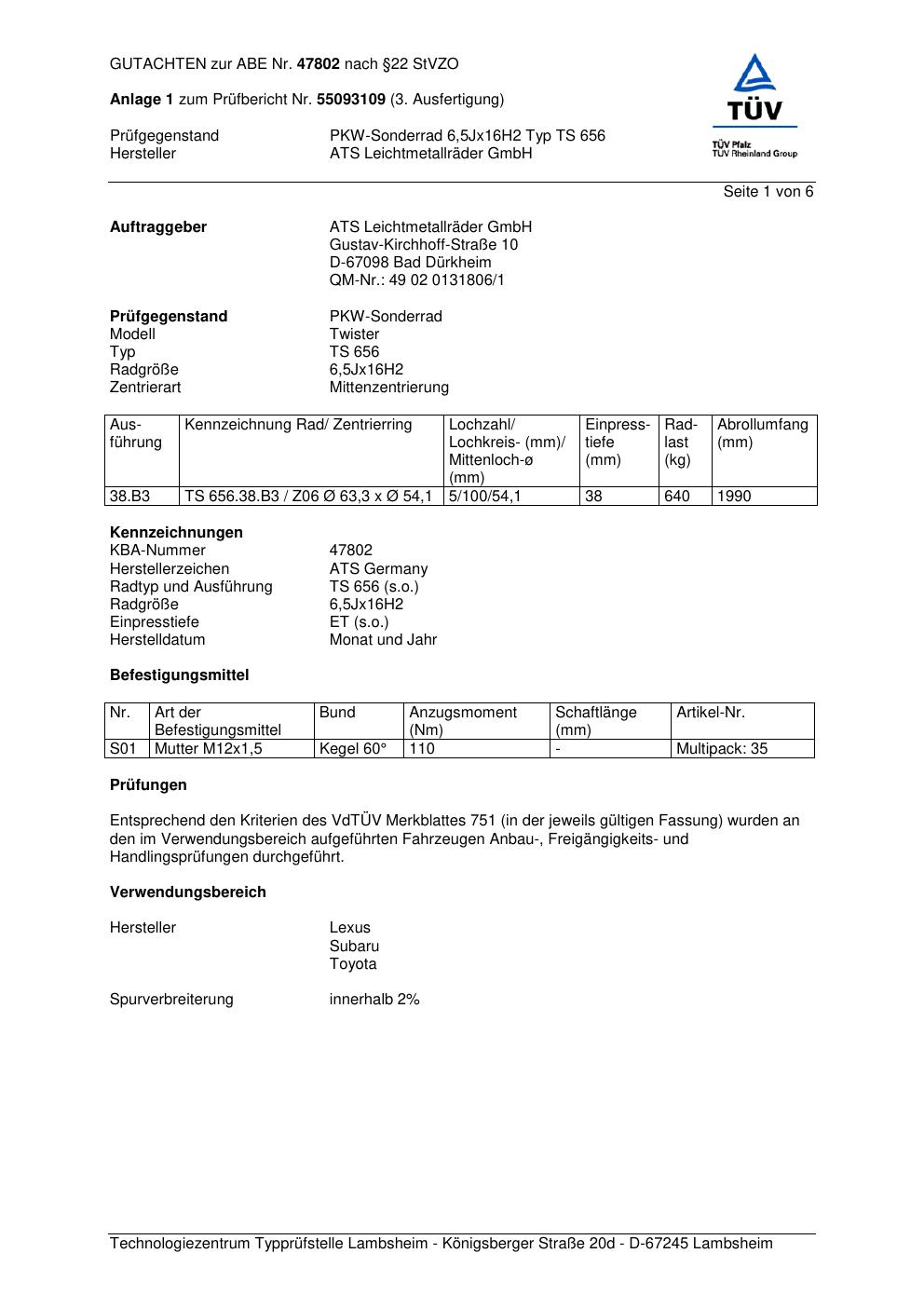 Dieses Gutachten (abe) bezieht sich auf die Alufelge ATS TS 656 in der Ausführung 6.5Jx16 ET 0, Mittenloch 0 mm (KBA 47802). Im PDF findest du typischerweise zulässige Reifengrößen, Auflagen/Anbauhinweise und – je nach Dokument – Hinweise zur Eintragung.