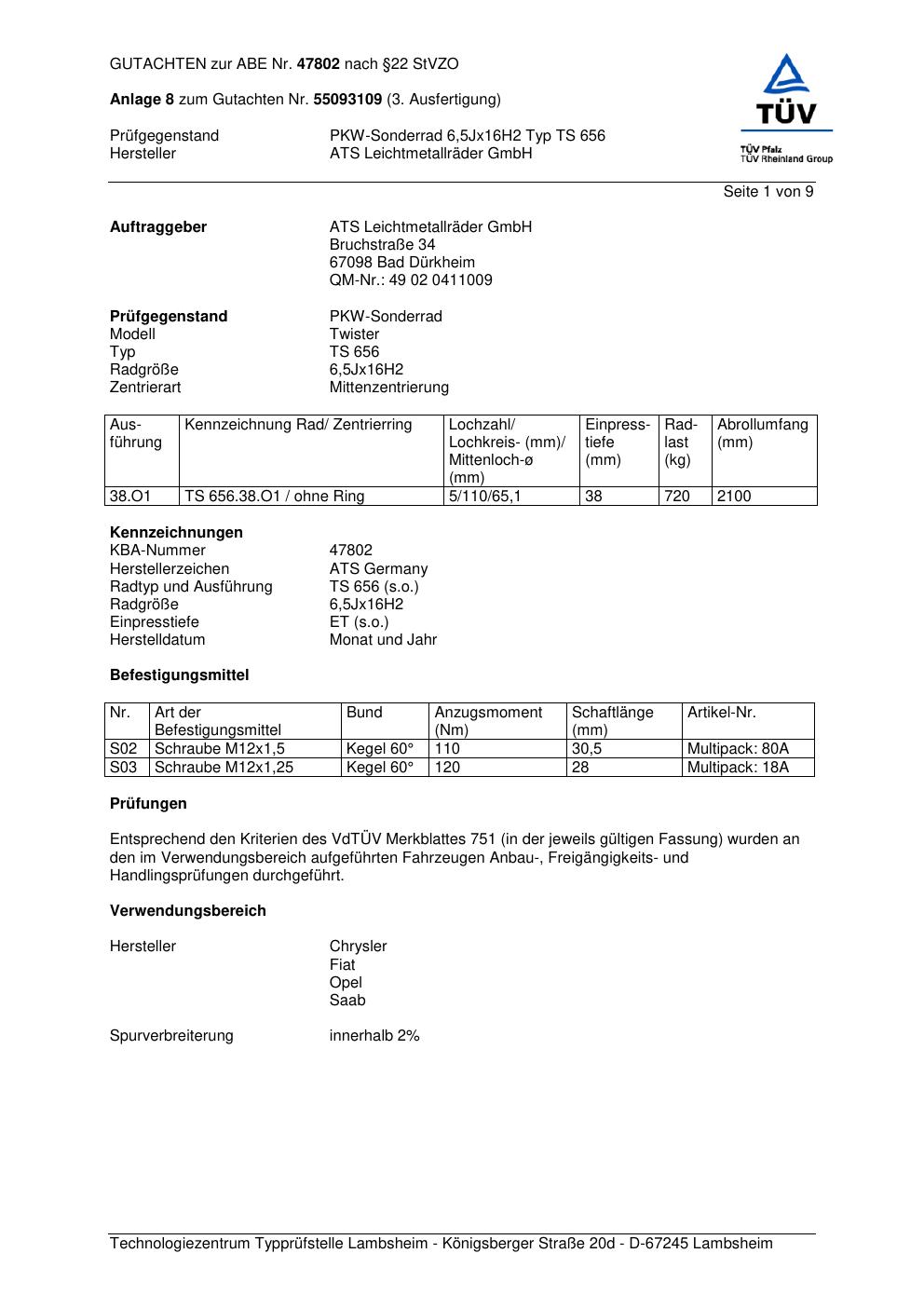Dieses Gutachten (abe) bezieht sich auf die Alufelge ATS TS 656 in der Ausführung 6.5Jx16 ET 0, Mittenloch 0 mm (KBA 47802). Im PDF findest du typischerweise zulässige Reifengrößen, Auflagen/Anbauhinweise und – je nach Dokument – Hinweise zur Eintragung.