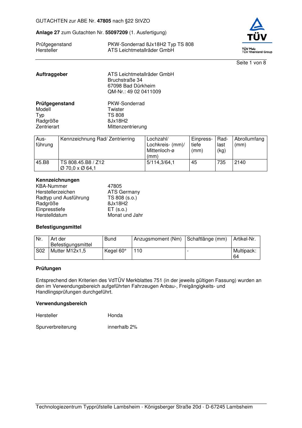 Dieses Gutachten (abe) bezieht sich auf die Alufelge ATS TS 808 in der Ausführung 8Jx18 ET 0, Mittenloch 0 mm (KBA 47805). Im PDF findest du typischerweise zulässige Reifengrößen, Auflagen/Anbauhinweise und – je nach Dokument – Hinweise zur Eintragung.