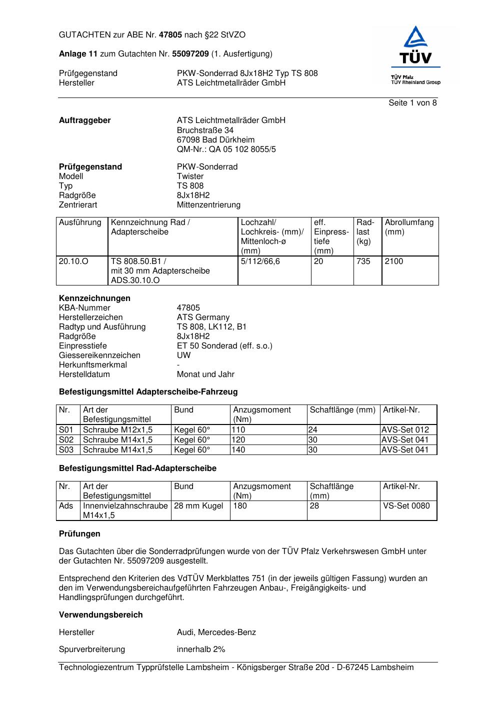Dieses Gutachten (abe) bezieht sich auf die Alufelge ATS TS 808 in der Ausführung 8Jx18 ET 0, Mittenloch 0 mm (KBA 47805). Im PDF findest du typischerweise zulässige Reifengrößen, Auflagen/Anbauhinweise und – je nach Dokument – Hinweise zur Eintragung.