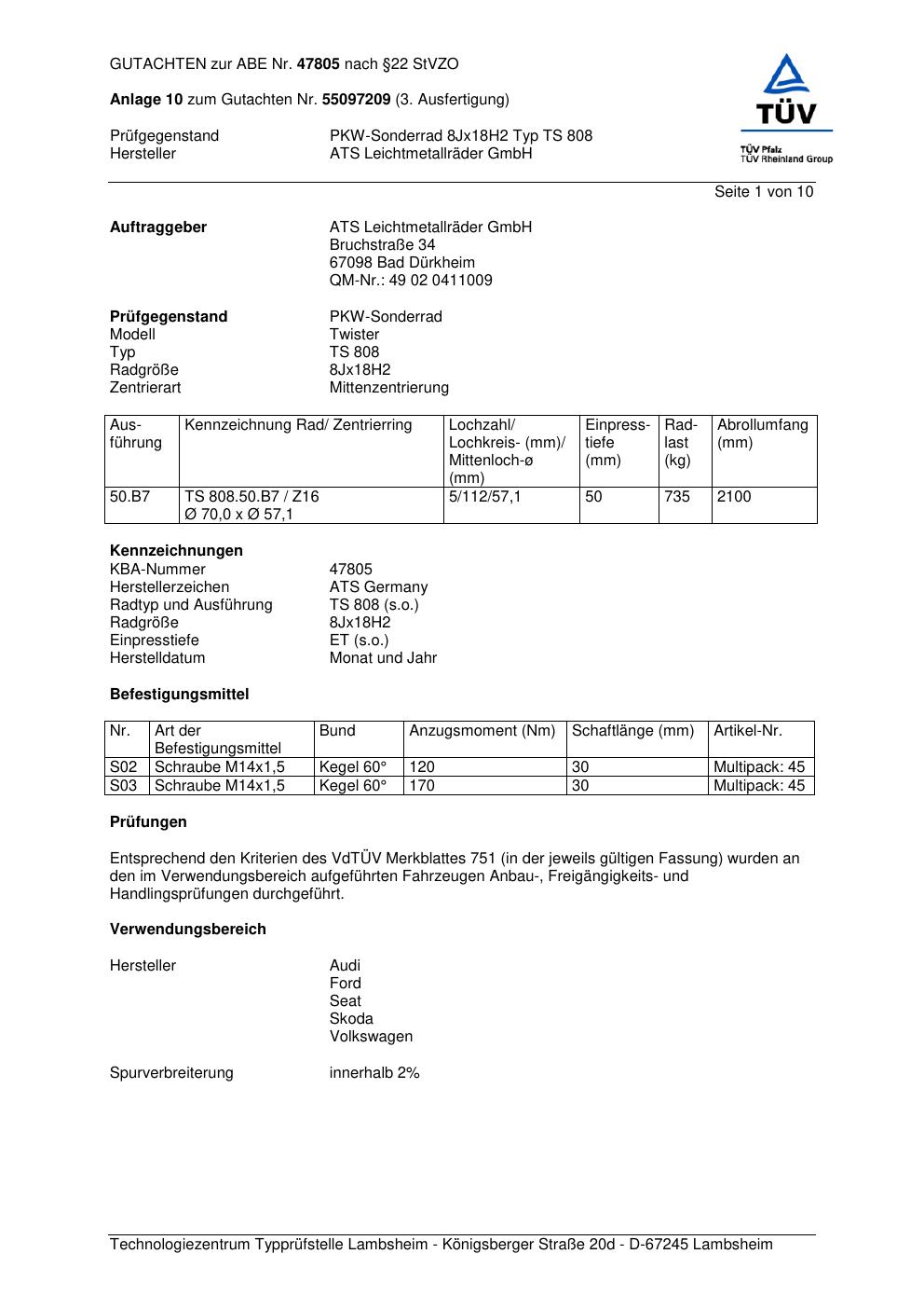 Felgengutachten / abe für Alufelgen ATS TS 808 (8Jx18 ET 0, Mittenloch 0 mm) mit KBA 47805 (Zertifikatsnummer 47805). Hier kostenlos als PDF herunterladen. Der Download-Link ist 24 Stunden gültig und kann bis zu zwei Mal verwendet werden.