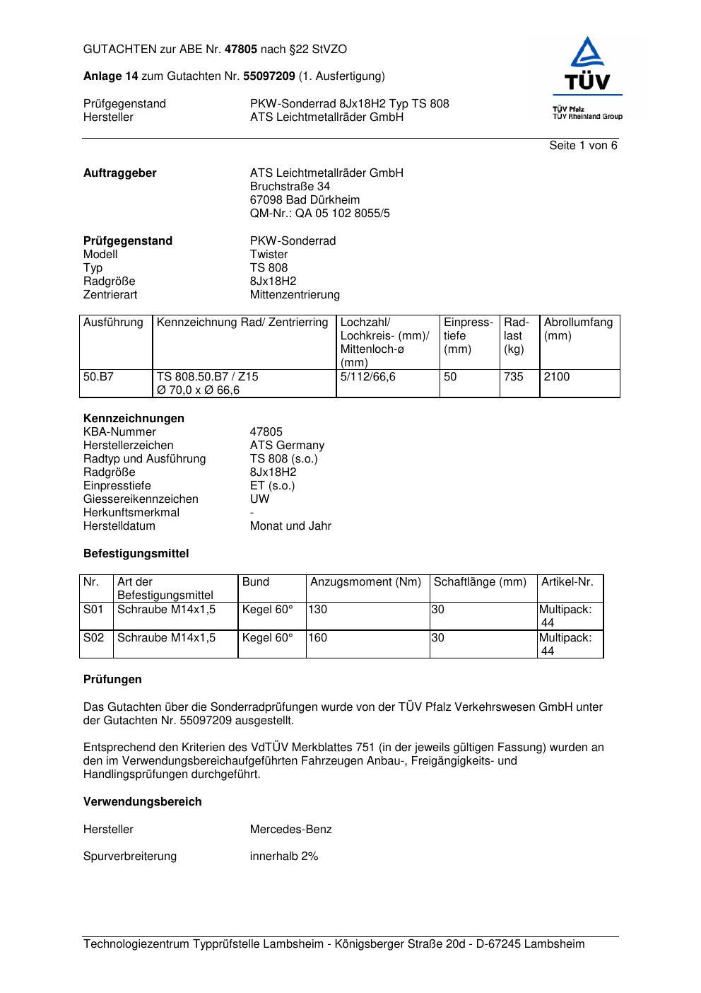 Dieses Gutachten (abe) bezieht sich auf die Alufelge ATS TS 808 in der Ausführung 8Jx18 ET 0, Mittenloch 0 mm (KBA 47805). Im PDF findest du typischerweise zulässige Reifengrößen, Auflagen/Anbauhinweise und – je nach Dokument – Hinweise zur Eintragung.