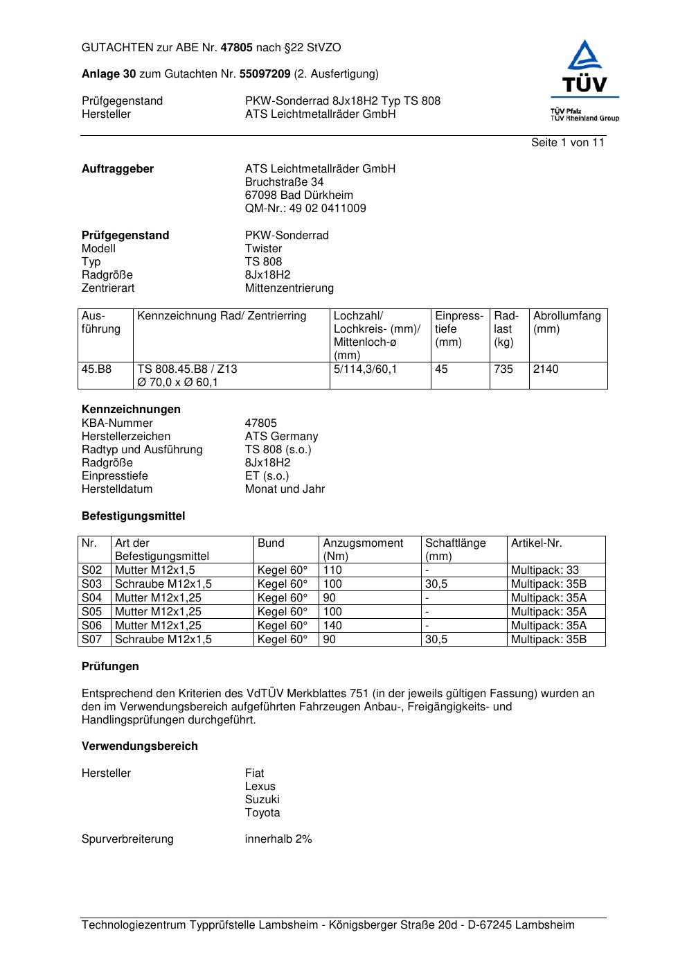 Dieses Gutachten (abe) bezieht sich auf die Alufelge ATS TS 808 in der Ausführung 8Jx18 ET 0, Mittenloch 0 mm (KBA 47805). Im PDF findest du typischerweise zulässige Reifengrößen, Auflagen/Anbauhinweise und – je nach Dokument – Hinweise zur Eintragung.