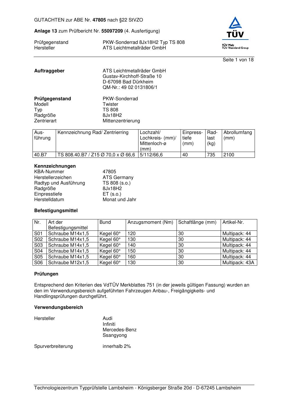Dieses Gutachten (abe) bezieht sich auf die Alufelge ATS TS 808 in der Ausführung 8Jx18 ET 0, Mittenloch 0 mm (KBA 47805). Im PDF findest du typischerweise zulässige Reifengrößen, Auflagen/Anbauhinweise und – je nach Dokument – Hinweise zur Eintragung.