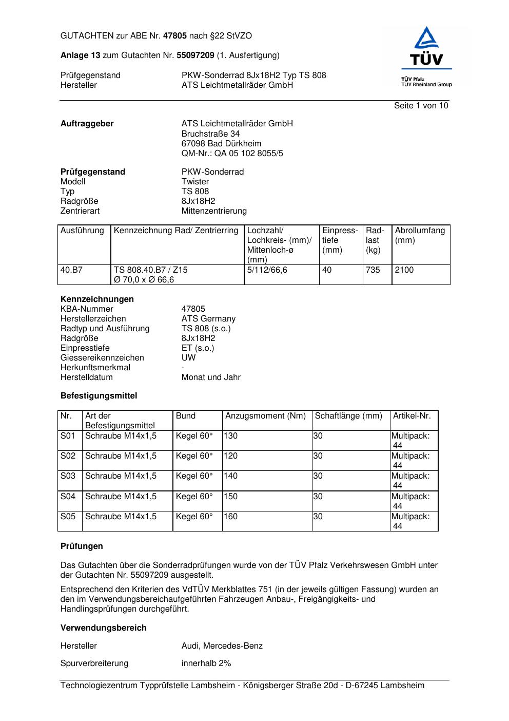 Dieses Gutachten (abe) bezieht sich auf die Alufelge ATS TS 808 in der Ausführung 8Jx18 ET 0, Mittenloch 0 mm (KBA 47805). Im PDF findest du typischerweise zulässige Reifengrößen, Auflagen/Anbauhinweise und – je nach Dokument – Hinweise zur Eintragung.