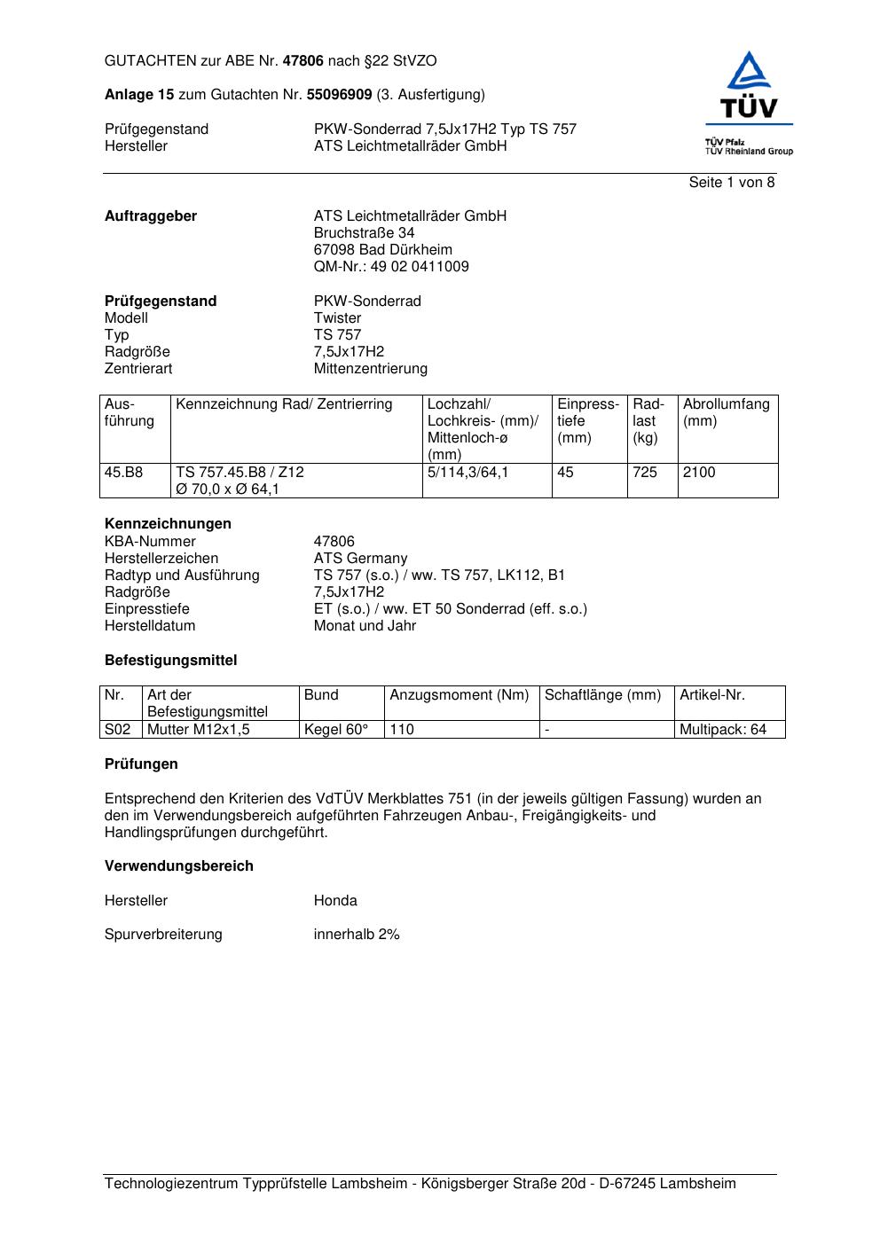 Dieses Gutachten (abe) bezieht sich auf die Alufelge ATS TS 757 in der Ausführung 7.5Jx17 ET 0, Mittenloch 0 mm (KBA 47806). Im PDF findest du typischerweise zulässige Reifengrößen, Auflagen/Anbauhinweise und – je nach Dokument – Hinweise zur Eintragung.