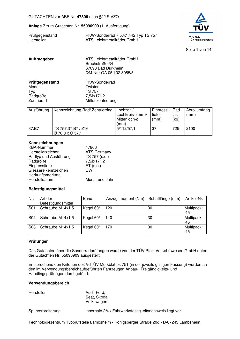 Dieses Gutachten (abe) bezieht sich auf die Alufelge ATS TS 757 in der Ausführung 7.5Jx17 ET 0, Mittenloch 0 mm (KBA 47806). Im PDF findest du typischerweise zulässige Reifengrößen, Auflagen/Anbauhinweise und – je nach Dokument – Hinweise zur Eintragung.