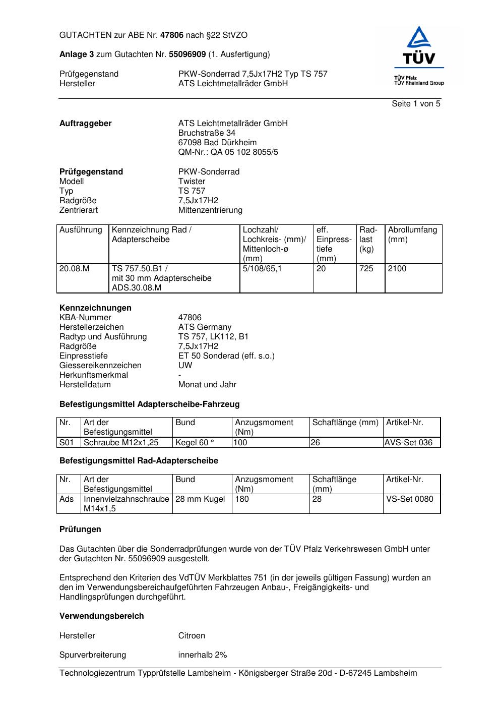 Dieses Gutachten (abe) bezieht sich auf die Alufelge ATS TS 757 in der Ausführung 7.5Jx17 ET 0, Mittenloch 0 mm (KBA 47806). Im PDF findest du typischerweise zulässige Reifengrößen, Auflagen/Anbauhinweise und – je nach Dokument – Hinweise zur Eintragung.