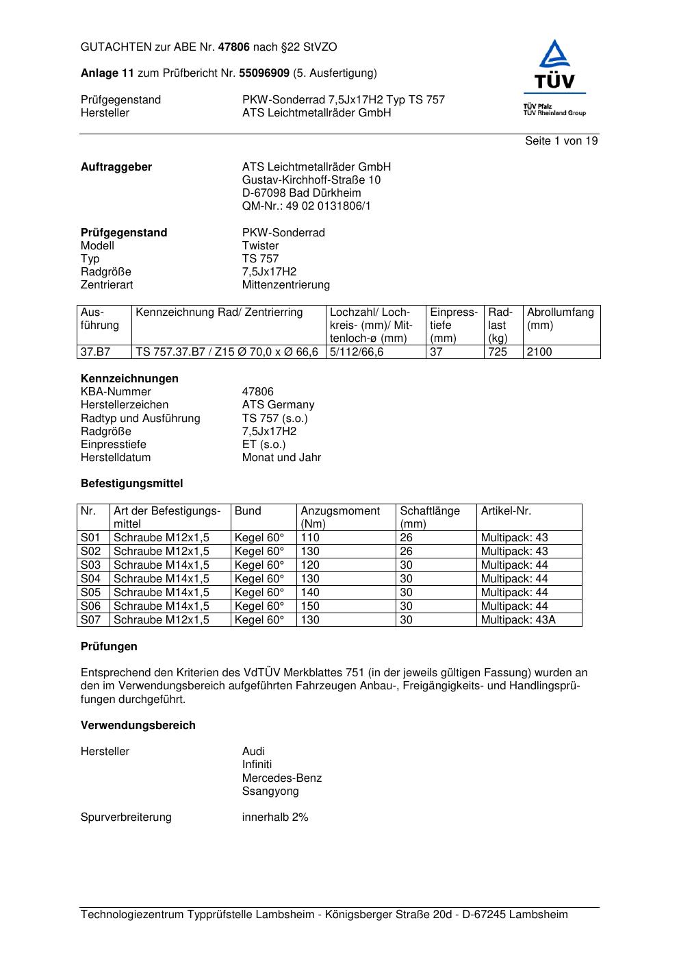 Dieses Gutachten (abe) bezieht sich auf die Alufelge ATS TS 757 in der Ausführung 7.5Jx17 ET 0, Mittenloch 0 mm (KBA 47806). Im PDF findest du typischerweise zulässige Reifengrößen, Auflagen/Anbauhinweise und – je nach Dokument – Hinweise zur Eintragung.