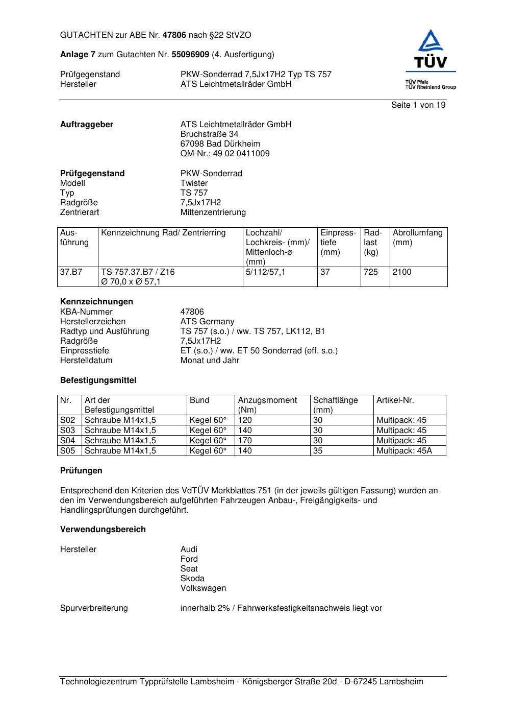Dieses Gutachten (abe) bezieht sich auf die Alufelge ATS TS 757 in der Ausführung 7.5Jx17 ET 0, Mittenloch 0 mm (KBA 47806). Im PDF findest du typischerweise zulässige Reifengrößen, Auflagen/Anbauhinweise und – je nach Dokument – Hinweise zur Eintragung.