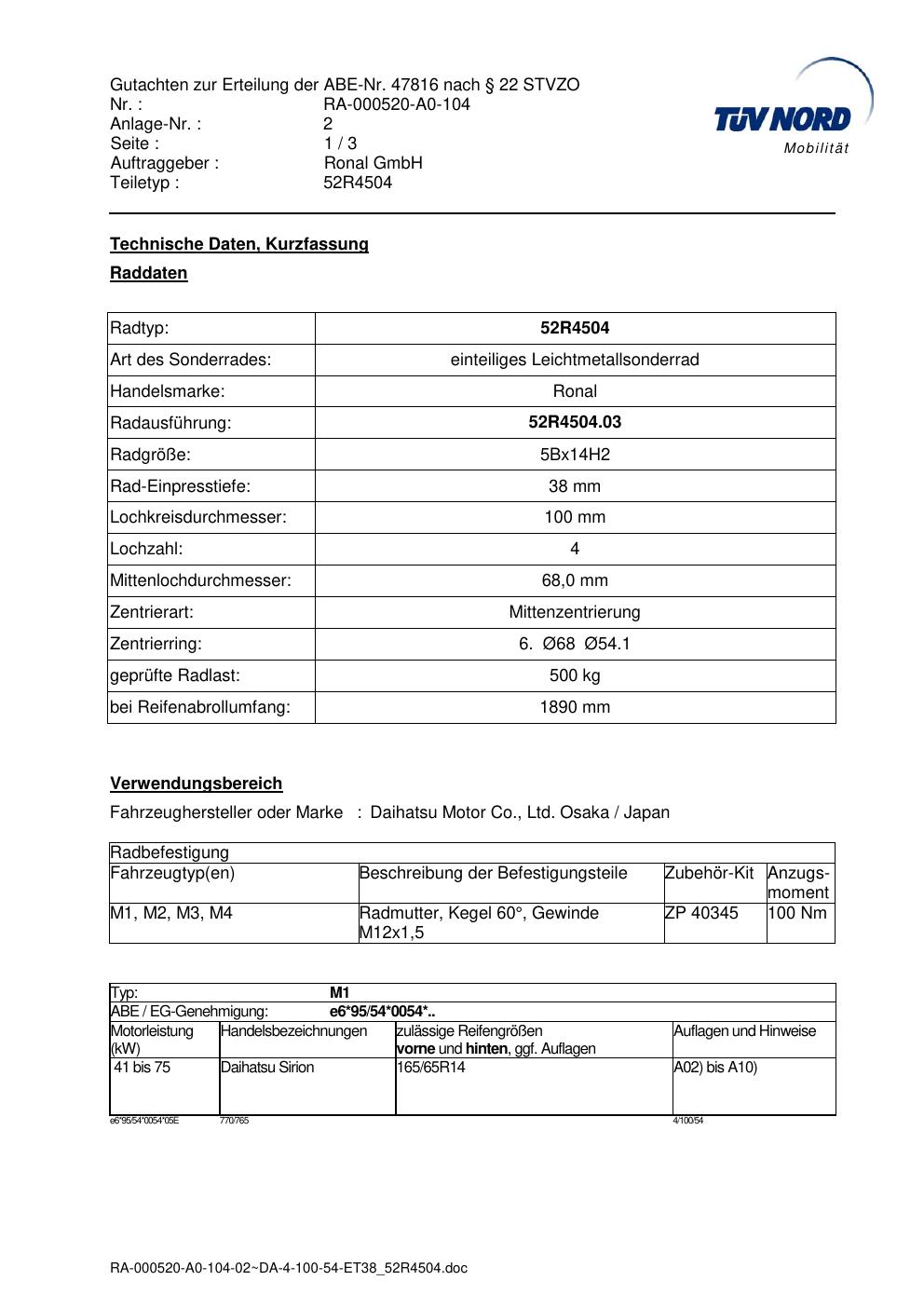 Dieses Gutachten (abe) bezieht sich auf die Alufelge ATS 52R4504 in der Ausführung ET 0, Mittenloch 0 mm (KBA 47816). Im PDF findest du typischerweise zulässige Reifengrößen, Auflagen/Anbauhinweise und – je nach Dokument – Hinweise zur Eintragung.