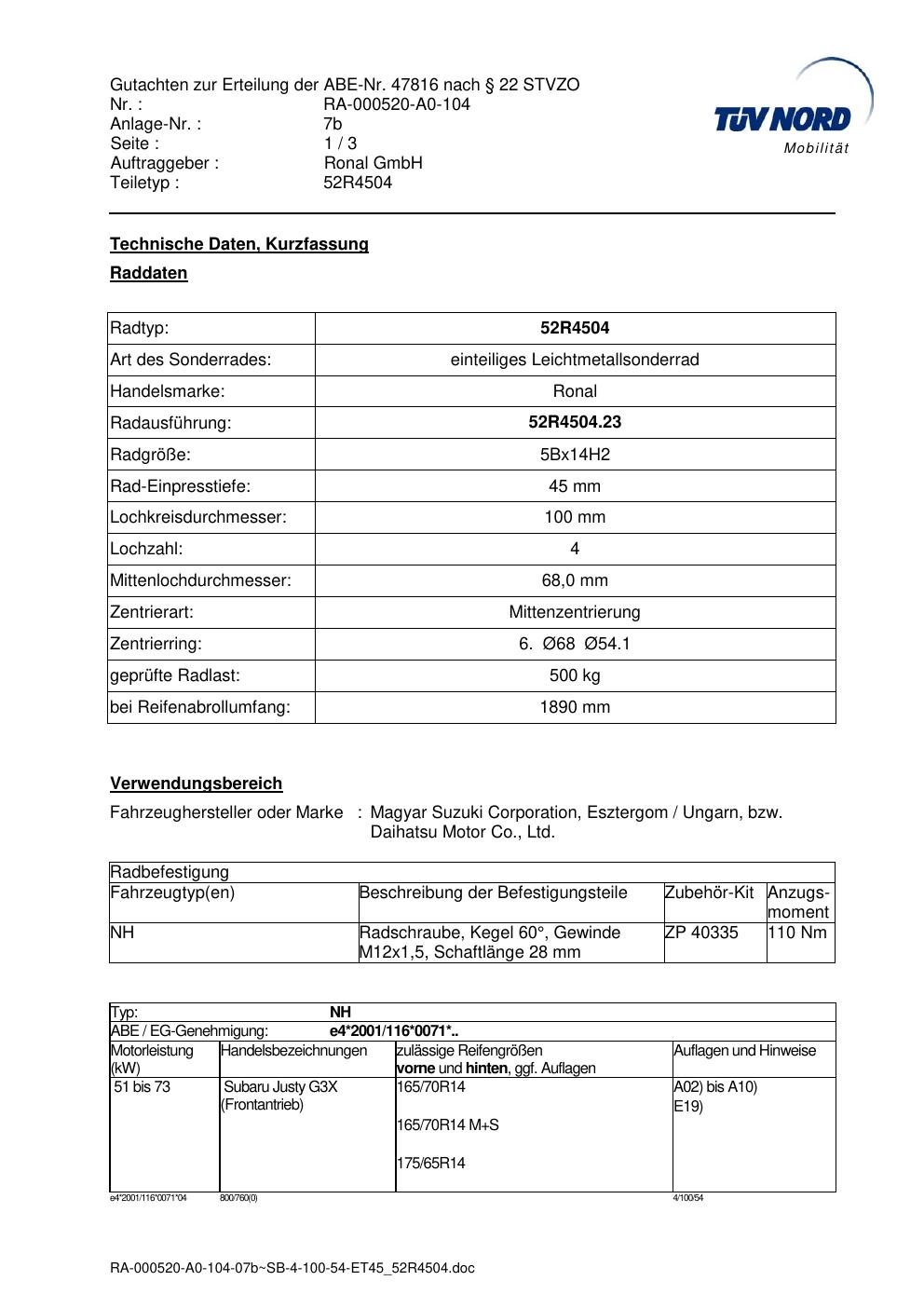 Dieses Gutachten (abe) bezieht sich auf die Alufelge ATS 52R4504 in der Ausführung ET 0, Mittenloch 0 mm (KBA 47816). Im PDF findest du typischerweise zulässige Reifengrößen, Auflagen/Anbauhinweise und – je nach Dokument – Hinweise zur Eintragung.