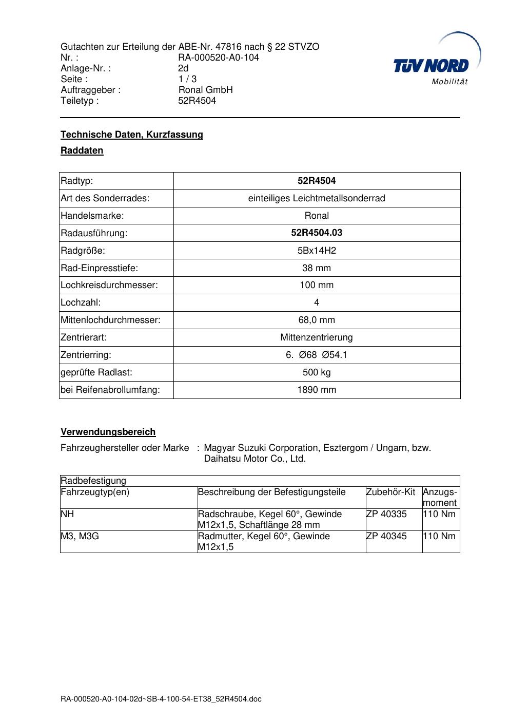 Dieses Gutachten (abe) bezieht sich auf die Alufelge ATS 52R4504 in der Ausführung ET 0, Mittenloch 0 mm (KBA 47816). Im PDF findest du typischerweise zulässige Reifengrößen, Auflagen/Anbauhinweise und – je nach Dokument – Hinweise zur Eintragung.