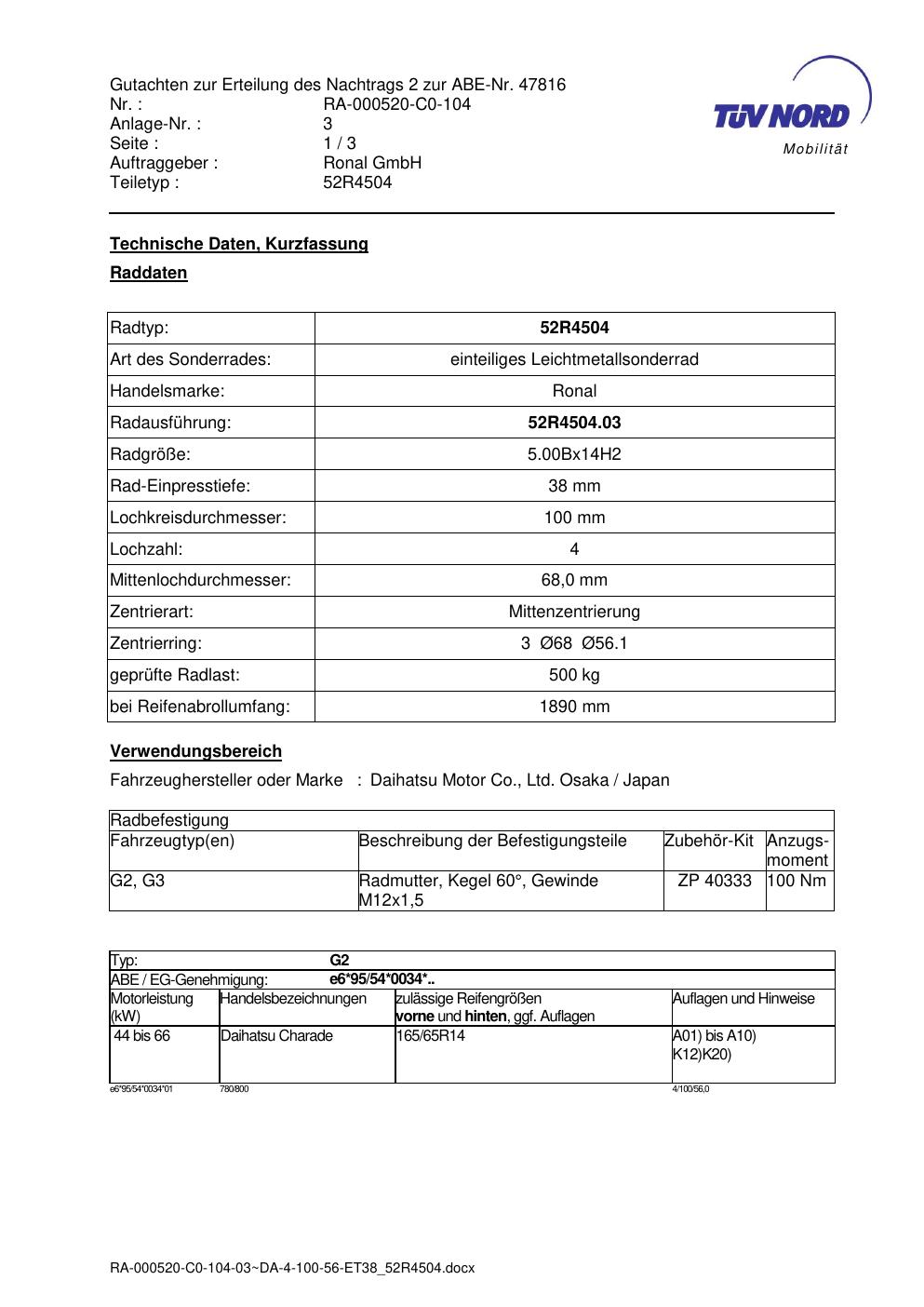 Dieses Gutachten (abe) bezieht sich auf die Alufelge ATS 52R4504 in der Ausführung ET 0, Mittenloch 0 mm (KBA 47816). Im PDF findest du typischerweise zulässige Reifengrößen, Auflagen/Anbauhinweise und – je nach Dokument – Hinweise zur Eintragung.