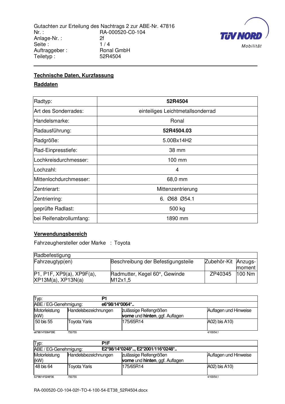 Dieses Gutachten (abe) bezieht sich auf die Alufelge Ronal 52R4504 in der Ausführung ET 0, Mittenloch 0 mm (KBA 47816). Im PDF findest du typischerweise zulässige Reifengrößen, Auflagen/Anbauhinweise und – je nach Dokument – Hinweise zur Eintragung.