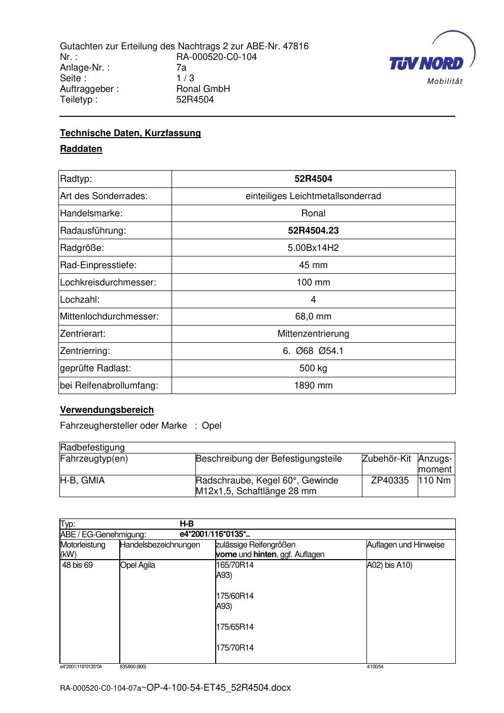 Dieses Gutachten (abe) bezieht sich auf die Alufelge Ronal 52R4504 in der Ausführung ET 0, Mittenloch 0 mm (KBA 47816). Im PDF findest du typischerweise zulässige Reifengrößen, Auflagen/Anbauhinweise und – je nach Dokument – Hinweise zur Eintragung.