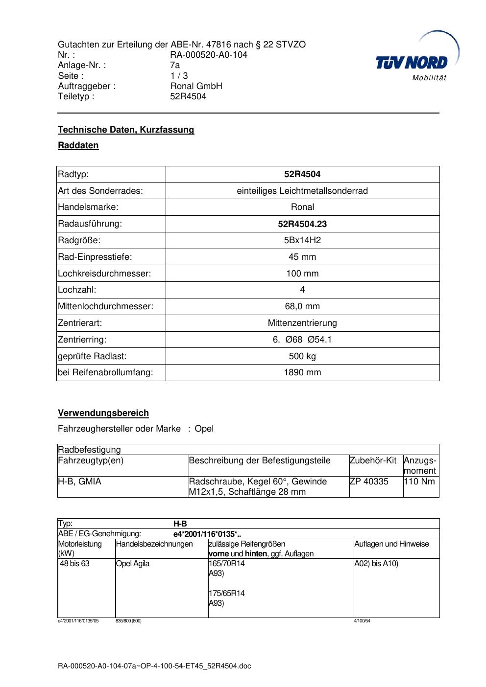 Dieses Gutachten (abe) bezieht sich auf die Alufelge Ronal 52R4504 in der Ausführung ET 0, Mittenloch 0 mm (KBA 47816). Im PDF findest du typischerweise zulässige Reifengrößen, Auflagen/Anbauhinweise und – je nach Dokument – Hinweise zur Eintragung.