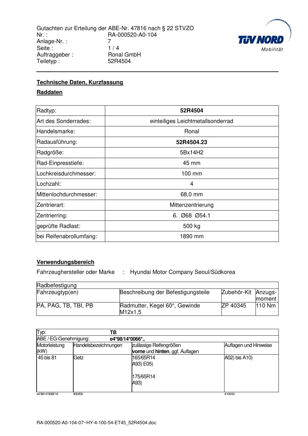 Dieses Gutachten (abe) bezieht sich auf die Alufelge Ronal 52R4504 in der Ausführung ET 0, Mittenloch 0 mm (KBA 47816). Im PDF findest du typischerweise zulässige Reifengrößen, Auflagen/Anbauhinweise und – je nach Dokument – Hinweise zur Eintragung.