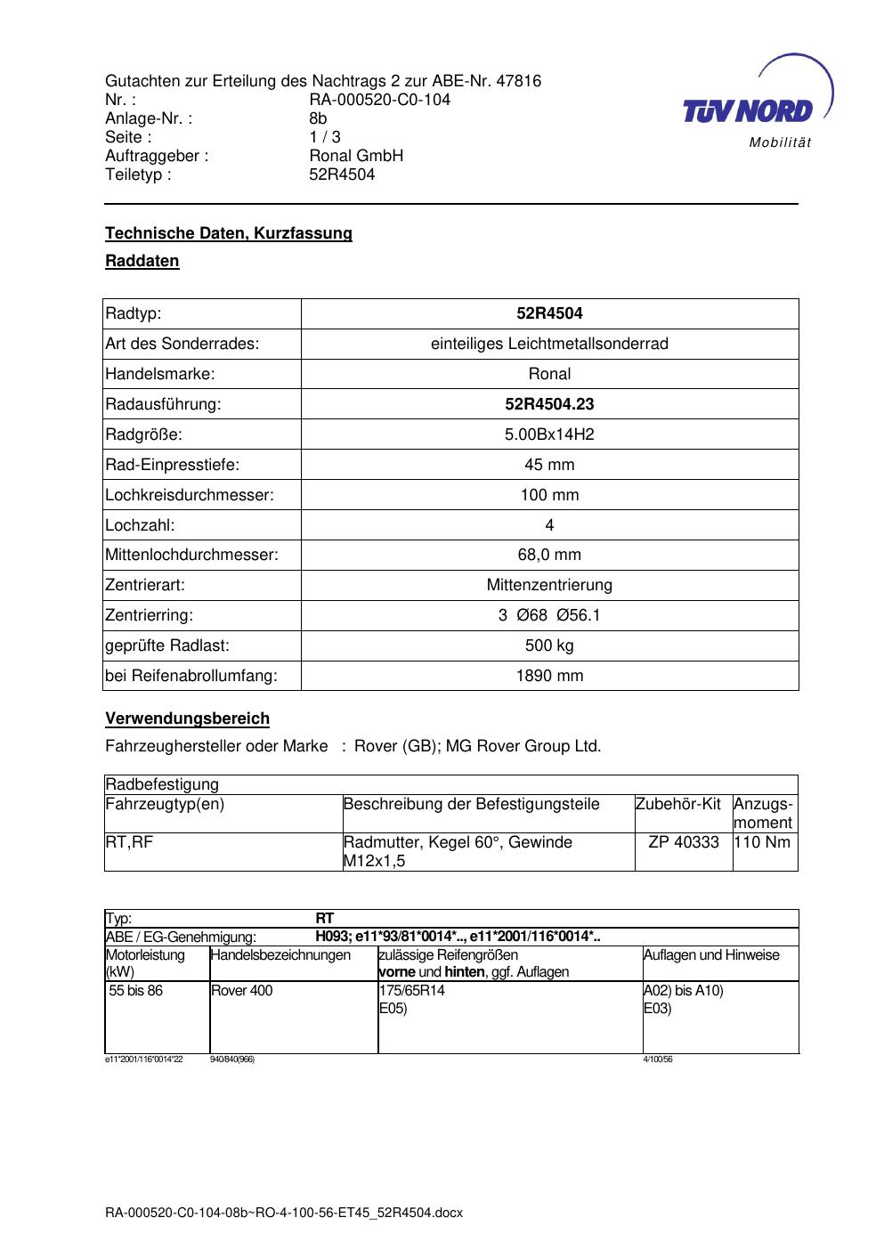 Dieses Gutachten (abe) bezieht sich auf die Alufelge Ronal 52R4504 in der Ausführung ET 0, Mittenloch 0 mm (KBA 47816). Im PDF findest du typischerweise zulässige Reifengrößen, Auflagen/Anbauhinweise und – je nach Dokument – Hinweise zur Eintragung.