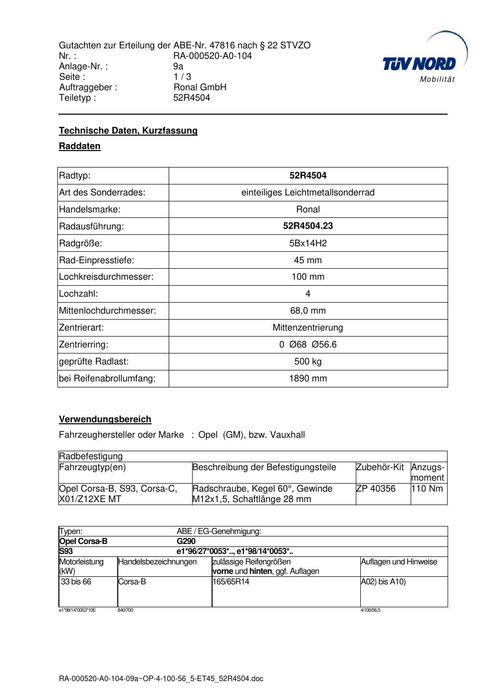 Dieses Gutachten (abe) bezieht sich auf die Alufelge Ronal 52R4504 in der Ausführung ET 0, Mittenloch 0 mm (KBA 47816). Im PDF findest du typischerweise zulässige Reifengrößen, Auflagen/Anbauhinweise und – je nach Dokument – Hinweise zur Eintragung.