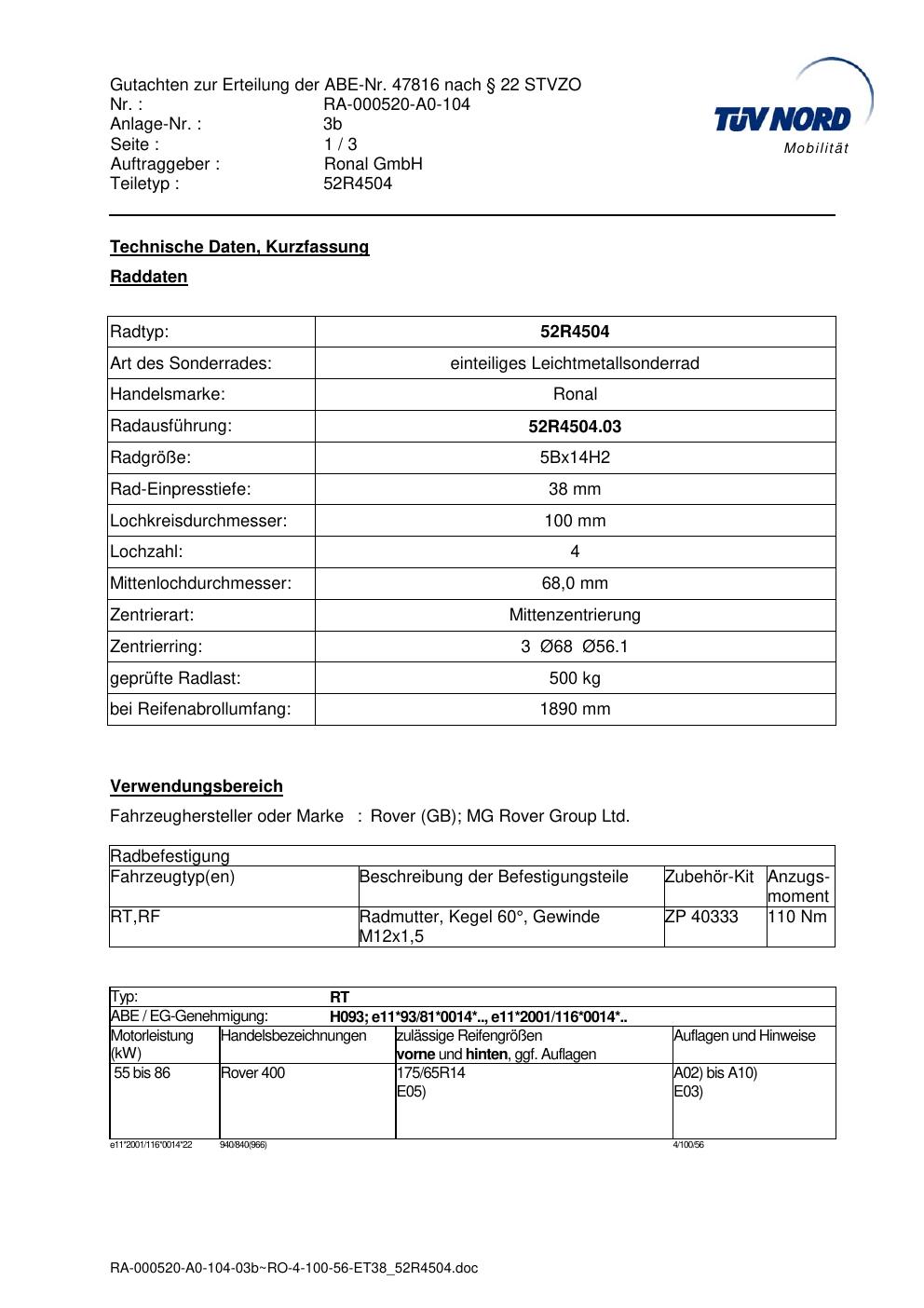Dieses Gutachten (abe) bezieht sich auf die Alufelge Ronal 52R4504 in der Ausführung ET 0, Mittenloch 0 mm (KBA 47816). Im PDF findest du typischerweise zulässige Reifengrößen, Auflagen/Anbauhinweise und – je nach Dokument – Hinweise zur Eintragung.