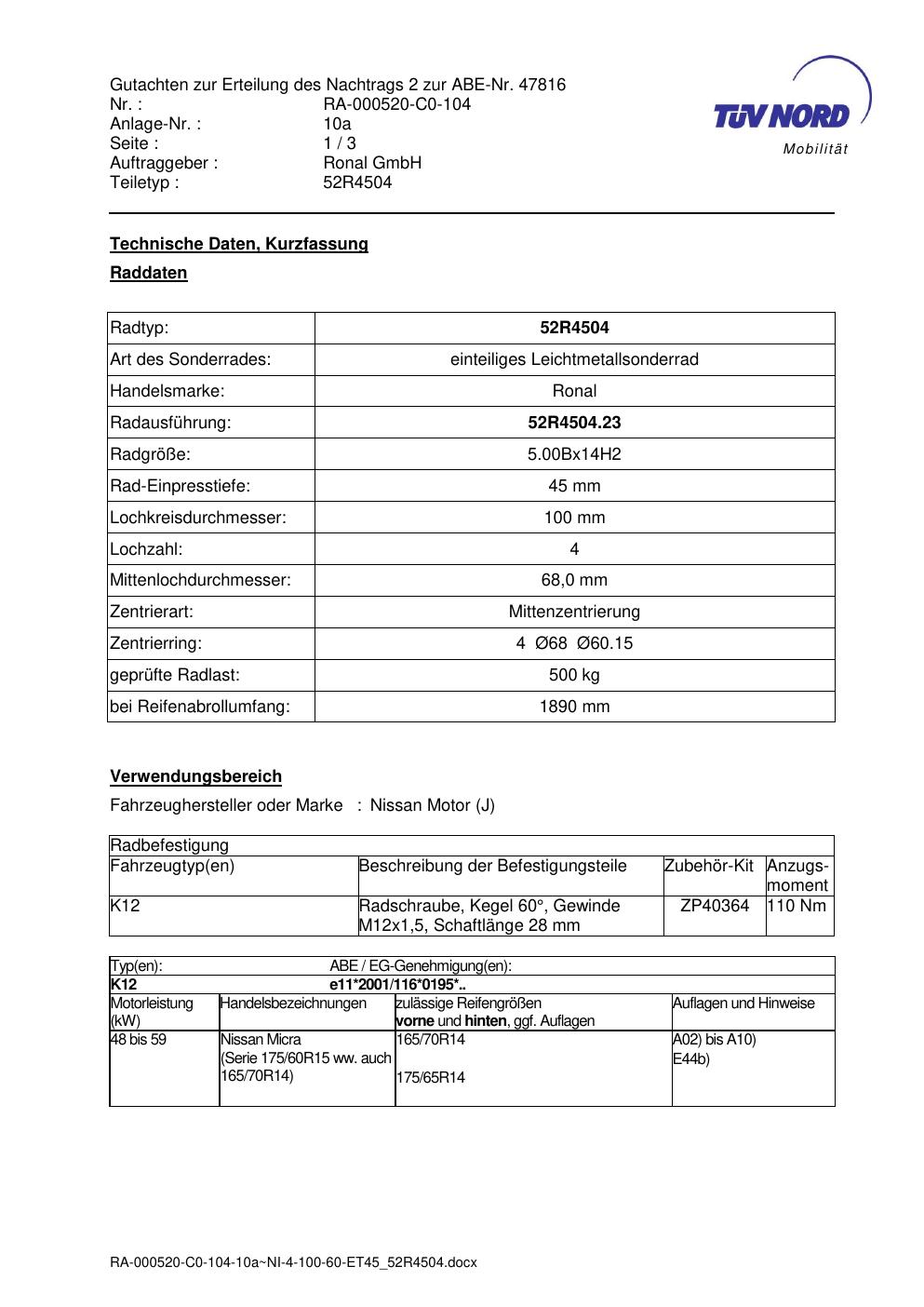 Dieses Gutachten (abe) bezieht sich auf die Alufelge Ronal 52R4504 in der Ausführung ET 0, Mittenloch 0 mm (KBA 47816). Im PDF findest du typischerweise zulässige Reifengrößen, Auflagen/Anbauhinweise und – je nach Dokument – Hinweise zur Eintragung.