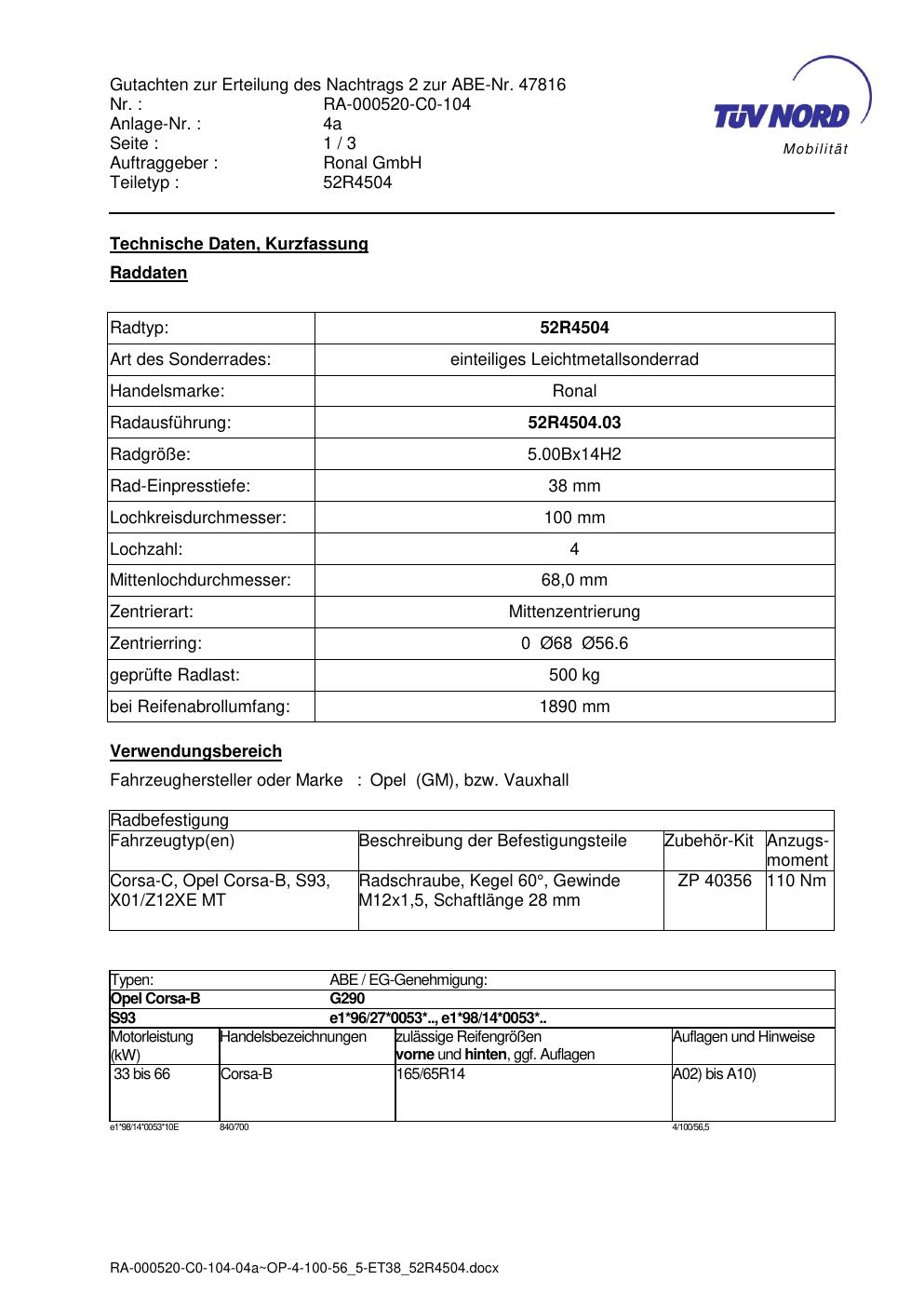 Dieses Gutachten (abe) bezieht sich auf die Alufelge Ronal 52R4504 in der Ausführung ET 0, Mittenloch 0 mm (KBA 47816). Im PDF findest du typischerweise zulässige Reifengrößen, Auflagen/Anbauhinweise und – je nach Dokument – Hinweise zur Eintragung.