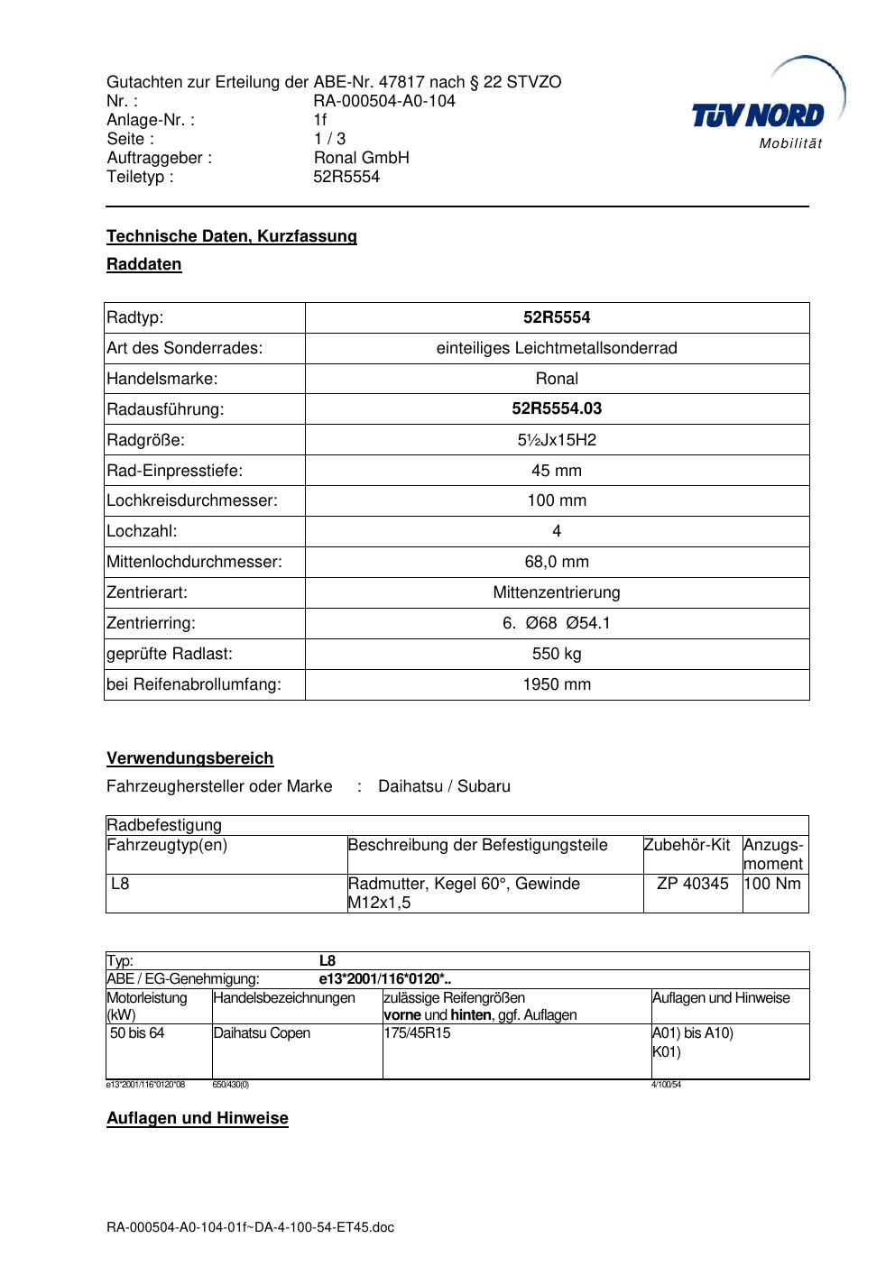 Dieses Gutachten (abe) bezieht sich auf die Alufelge ATS 52R5554 in der Ausführung ET 0, Mittenloch 0 mm (KBA 47817). Im PDF findest du typischerweise zulässige Reifengrößen, Auflagen/Anbauhinweise und – je nach Dokument – Hinweise zur Eintragung.
