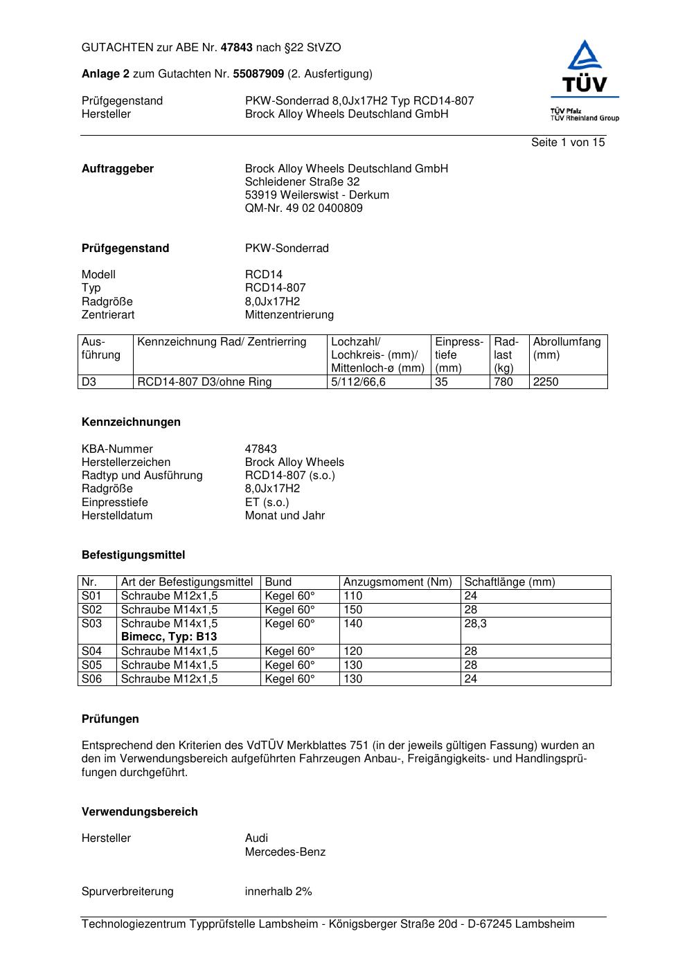 Dieses Gutachten (abe) bezieht sich auf die Alufelge Brock RCD14-80 7 in der Ausführung 8Jx17 ET 0, Mittenloch 0 mm (KBA 47843). Im PDF findest du typischerweise zulässige Reifengrößen, Auflagen/Anbauhinweise und – je nach Dokument – Hinweise zur Eintragung.