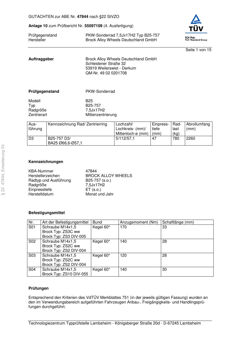 Dieses Gutachten (abe) bezieht sich auf die Alufelge Brock B25-757 in der Ausführung 7.5Jx17 ET 0, Mittenloch 0 mm (KBA 47844). Im PDF findest du typischerweise zulässige Reifengrößen, Auflagen/Anbauhinweise und – je nach Dokument – Hinweise zur Eintragung.