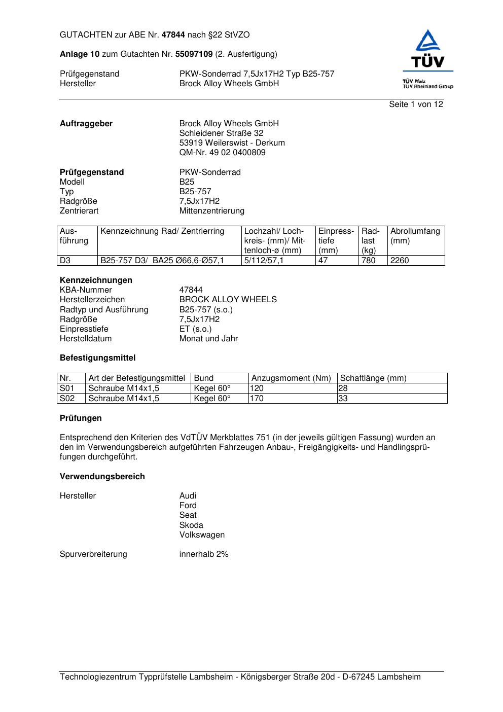Dieses Gutachten (abe) bezieht sich auf die Alufelge Brock B25-757 in der Ausführung 7.5Jx17 ET 0, Mittenloch 0 mm (KBA 47844). Im PDF findest du typischerweise zulässige Reifengrößen, Auflagen/Anbauhinweise und – je nach Dokument – Hinweise zur Eintragung.