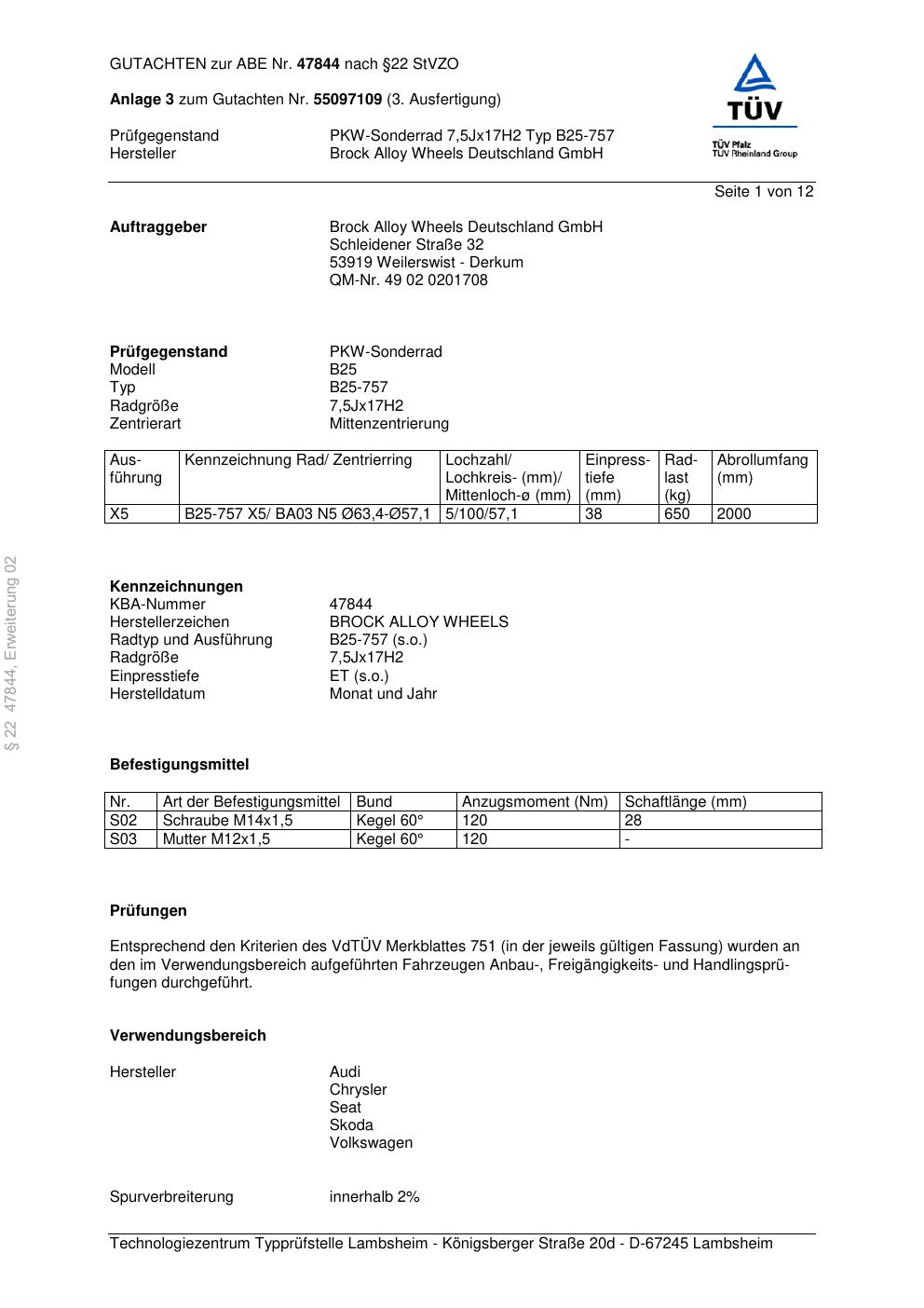 Dieses Gutachten (abe) bezieht sich auf die Alufelge Brock B25-757 in der Ausführung 7.5Jx17 ET 0, Mittenloch 0 mm (KBA 47844). Im PDF findest du typischerweise zulässige Reifengrößen, Auflagen/Anbauhinweise und – je nach Dokument – Hinweise zur Eintragung.