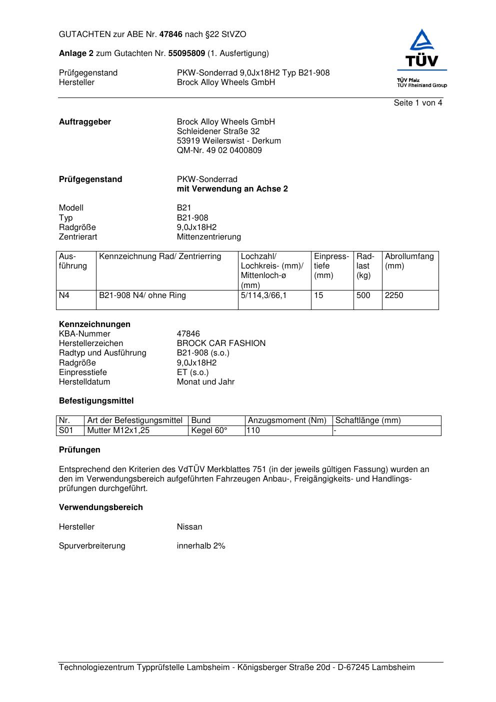 Dieses Gutachten (abe) bezieht sich auf die Alufelge Brock B21-908 in der Ausführung 9Jx18 ET 0, Mittenloch 0 mm (KBA 47846). Im PDF findest du typischerweise zulässige Reifengrößen, Auflagen/Anbauhinweise und – je nach Dokument – Hinweise zur Eintragung.