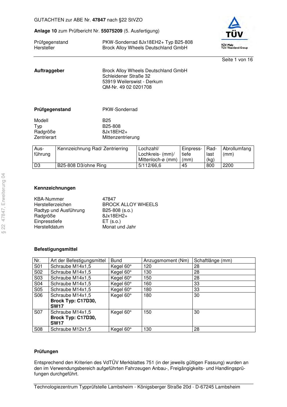 Dieses Gutachten (abe) bezieht sich auf die Alufelge Brock B25-808 in der Ausführung ET 0, Mittenloch 0 mm (KBA 47847). Im PDF findest du typischerweise zulässige Reifengrößen, Auflagen/Anbauhinweise und – je nach Dokument – Hinweise zur Eintragung.