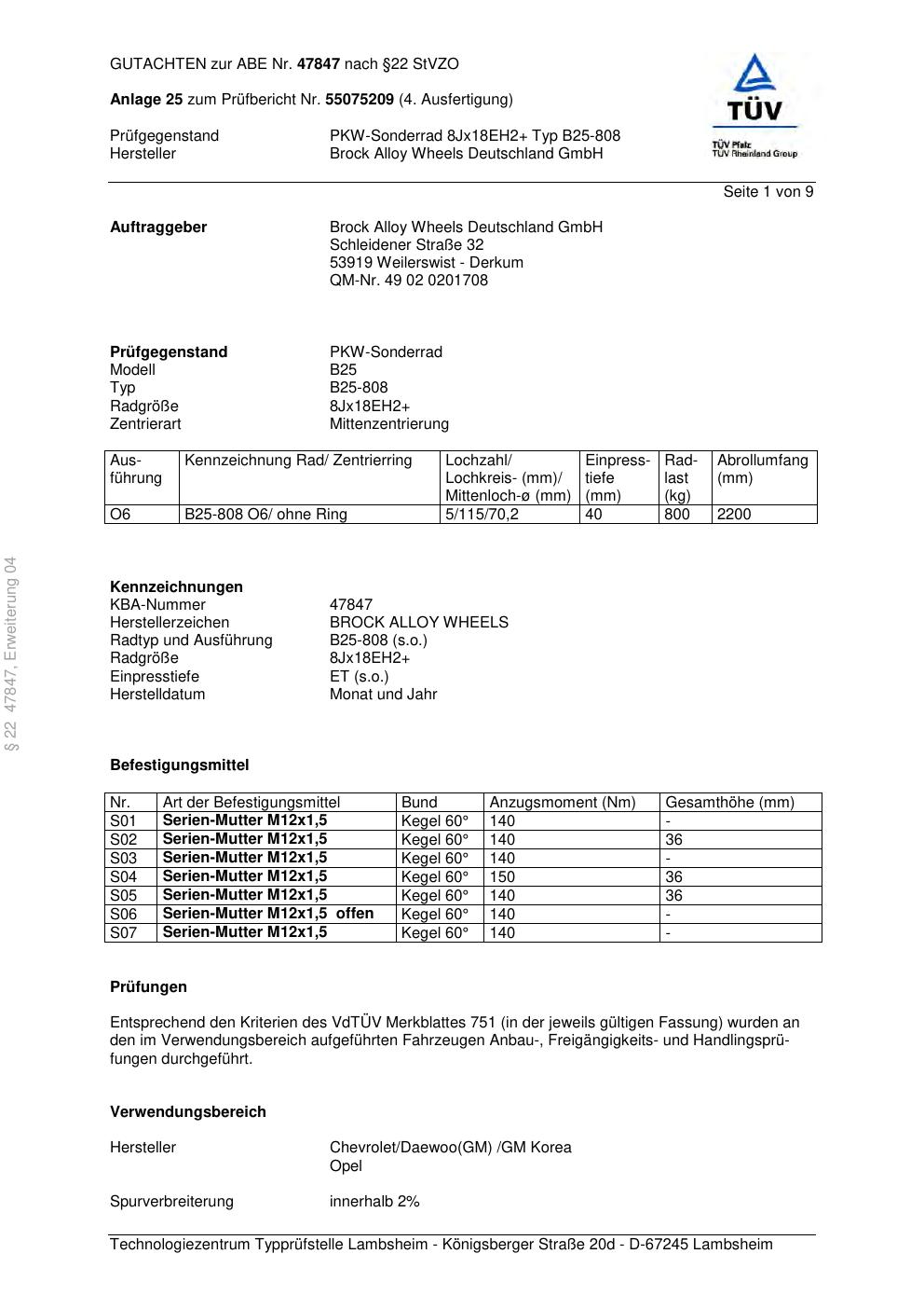 Dieses Gutachten (abe) bezieht sich auf die Alufelge Brock B25-808 in der Ausführung ET 0, Mittenloch 0 mm (KBA 47847). Im PDF findest du typischerweise zulässige Reifengrößen, Auflagen/Anbauhinweise und – je nach Dokument – Hinweise zur Eintragung.
