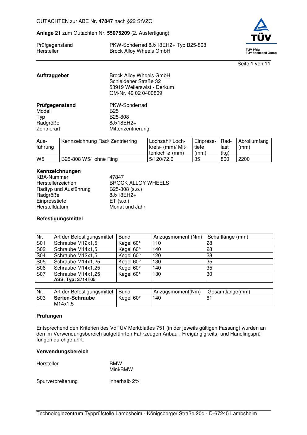 Dieses Gutachten (abe) bezieht sich auf die Alufelge Brock B25-808 in der Ausführung ET 0, Mittenloch 0 mm (KBA 47847). Im PDF findest du typischerweise zulässige Reifengrößen, Auflagen/Anbauhinweise und – je nach Dokument – Hinweise zur Eintragung.