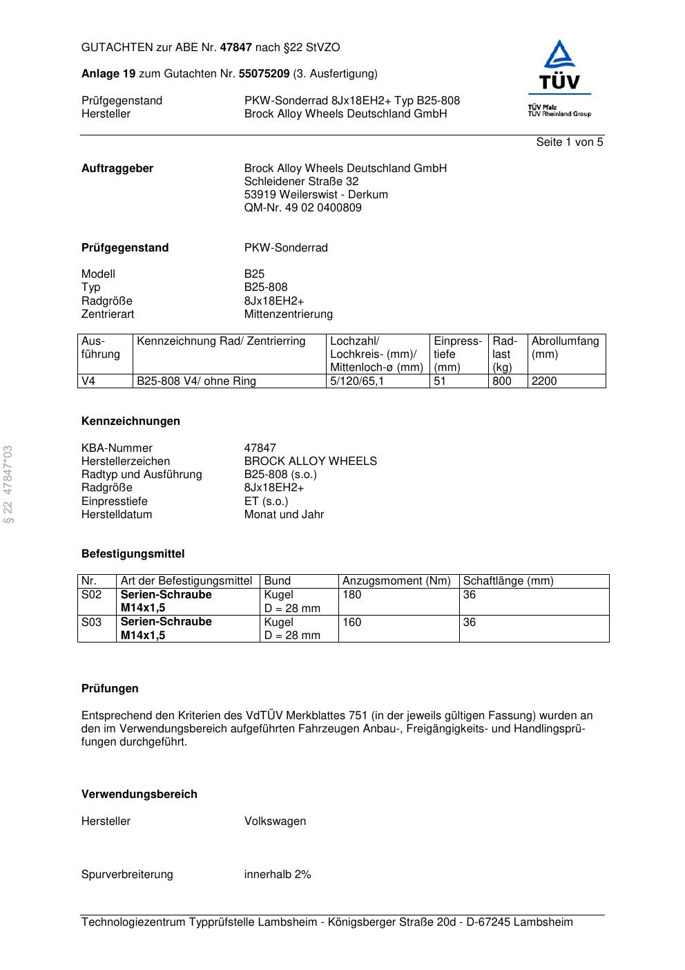 Dieses Gutachten (abe) bezieht sich auf die Alufelge Brock B25-808 in der Ausführung ET 0, Mittenloch 0 mm (KBA 47847). Im PDF findest du typischerweise zulässige Reifengrößen, Auflagen/Anbauhinweise und – je nach Dokument – Hinweise zur Eintragung.