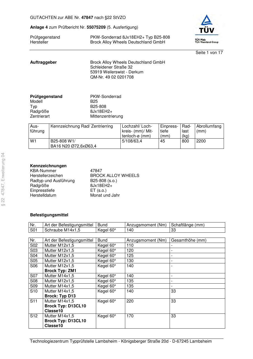 Dieses Gutachten (abe) bezieht sich auf die Alufelge Brock B25-808 in der Ausführung ET 0, Mittenloch 0 mm (KBA 47847). Im PDF findest du typischerweise zulässige Reifengrößen, Auflagen/Anbauhinweise und – je nach Dokument – Hinweise zur Eintragung.