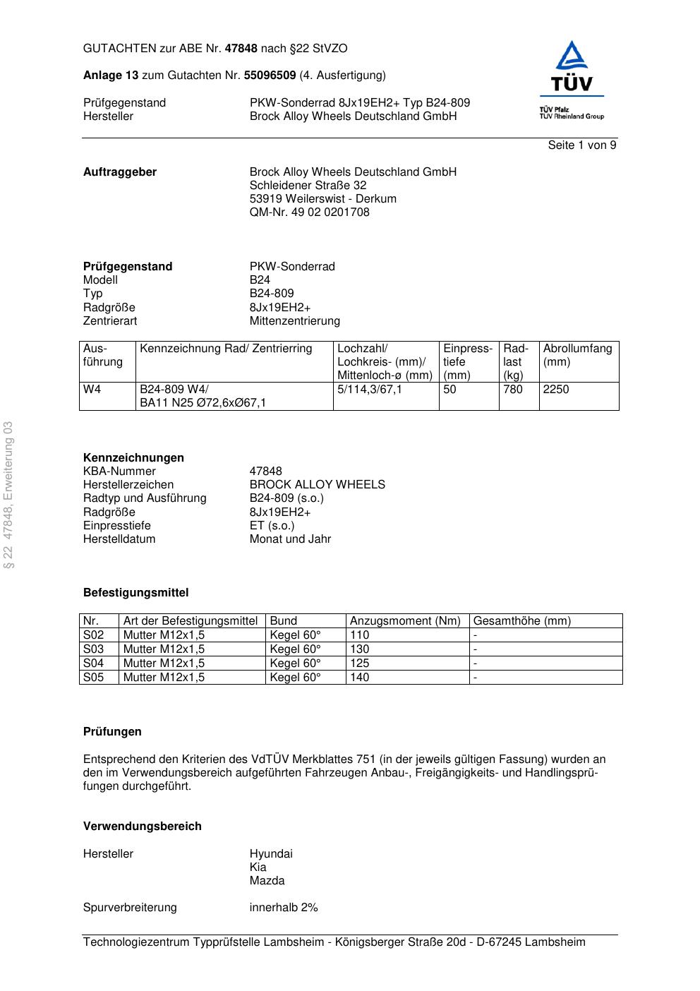 Dieses Gutachten (abe) bezieht sich auf die Alufelge Brock B24-809 in der Ausführung ET 0, Mittenloch 0 mm (KBA 47848). Im PDF findest du typischerweise zulässige Reifengrößen, Auflagen/Anbauhinweise und – je nach Dokument – Hinweise zur Eintragung.