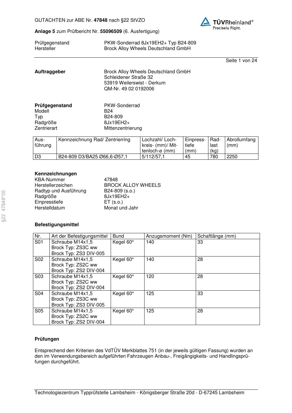 Dieses Gutachten (abe) bezieht sich auf die Alufelge Brock B24-809 in der Ausführung ET 0, Mittenloch 0 mm (KBA 47848). Im PDF findest du typischerweise zulässige Reifengrößen, Auflagen/Anbauhinweise und – je nach Dokument – Hinweise zur Eintragung.