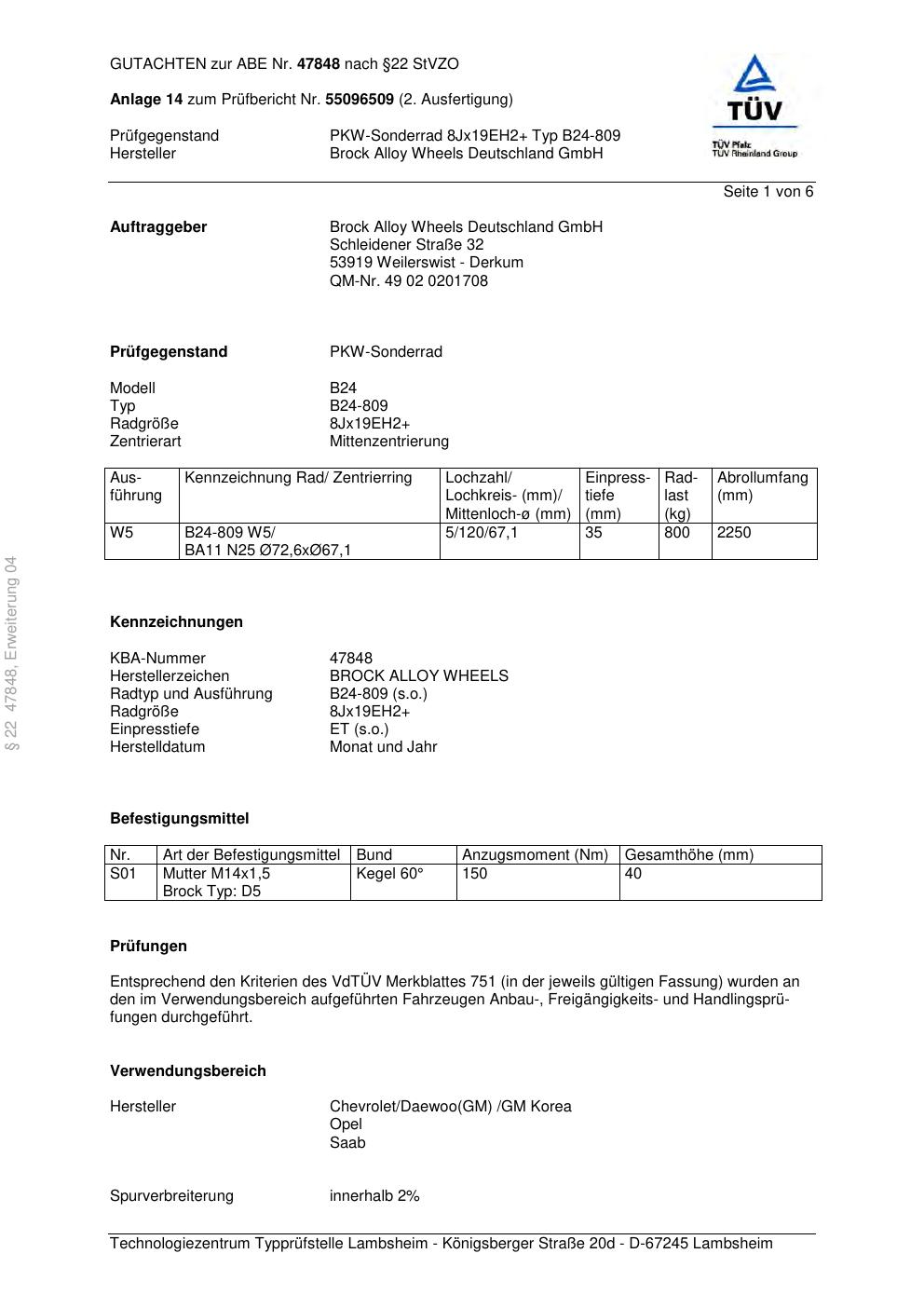 Dieses Gutachten (abe) bezieht sich auf die Alufelge Brock B24-809 in der Ausführung ET 0, Mittenloch 0 mm (KBA 47848). Im PDF findest du typischerweise zulässige Reifengrößen, Auflagen/Anbauhinweise und – je nach Dokument – Hinweise zur Eintragung.
