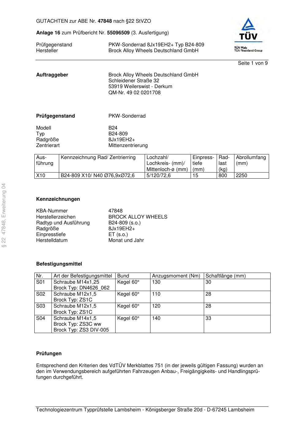 Dieses Gutachten (abe) bezieht sich auf die Alufelge Brock B24-809 in der Ausführung ET 0, Mittenloch 0 mm (KBA 47848). Im PDF findest du typischerweise zulässige Reifengrößen, Auflagen/Anbauhinweise und – je nach Dokument – Hinweise zur Eintragung.
