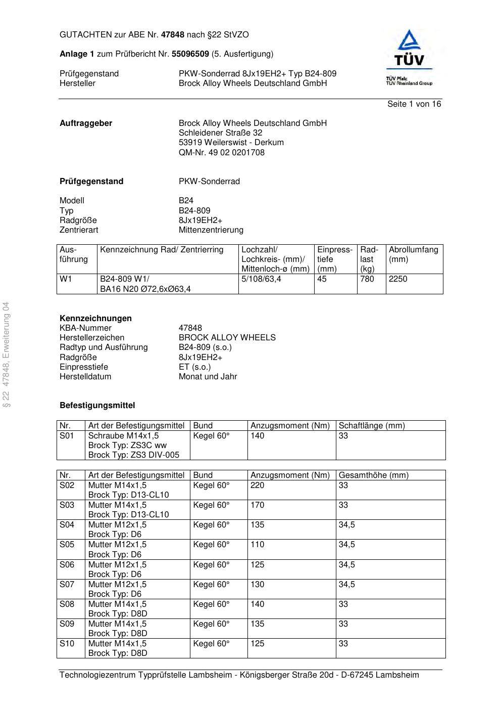 Dieses Gutachten (abe) bezieht sich auf die Alufelge Brock B24-809 in der Ausführung 8.5Jx21 ET 0, Mittenloch 0 mm (KBA 47848). Im PDF findest du typischerweise zulässige Reifengrößen, Auflagen/Anbauhinweise und – je nach Dokument – Hinweise zur Eintragung.