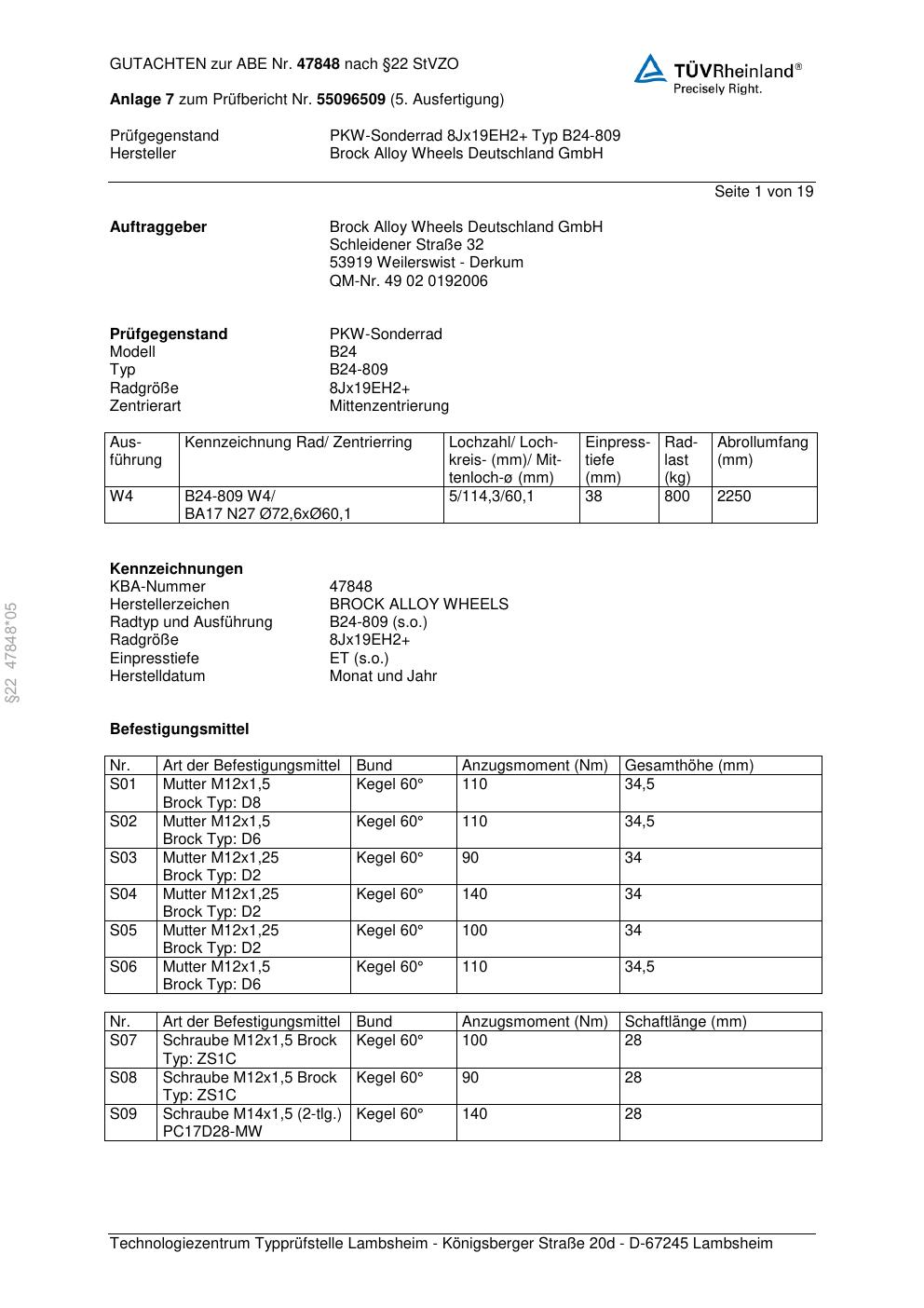 Dieses Gutachten (abe) bezieht sich auf die Alufelge Brock B24-809 in der Ausführung ET 0, Mittenloch 0 mm (KBA 47848). Im PDF findest du typischerweise zulässige Reifengrößen, Auflagen/Anbauhinweise und – je nach Dokument – Hinweise zur Eintragung.